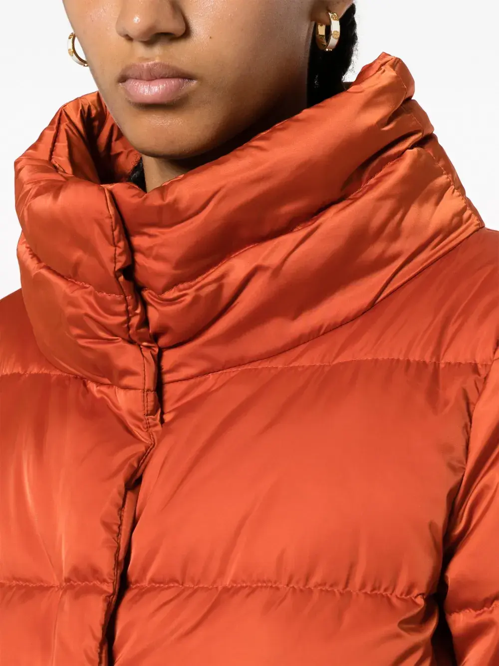 Тыквенно-оранжевый, наполнитель из пуха и перьев, дутый материал, стеганая модель, строчка в тон, подкладка из искусственного меха, съемный капюшон, высокий воротник, потайная застежка на кнопках спереди, потайная молния спереди, длинные рукава, два прорезных кармана по бокам и прямой подол