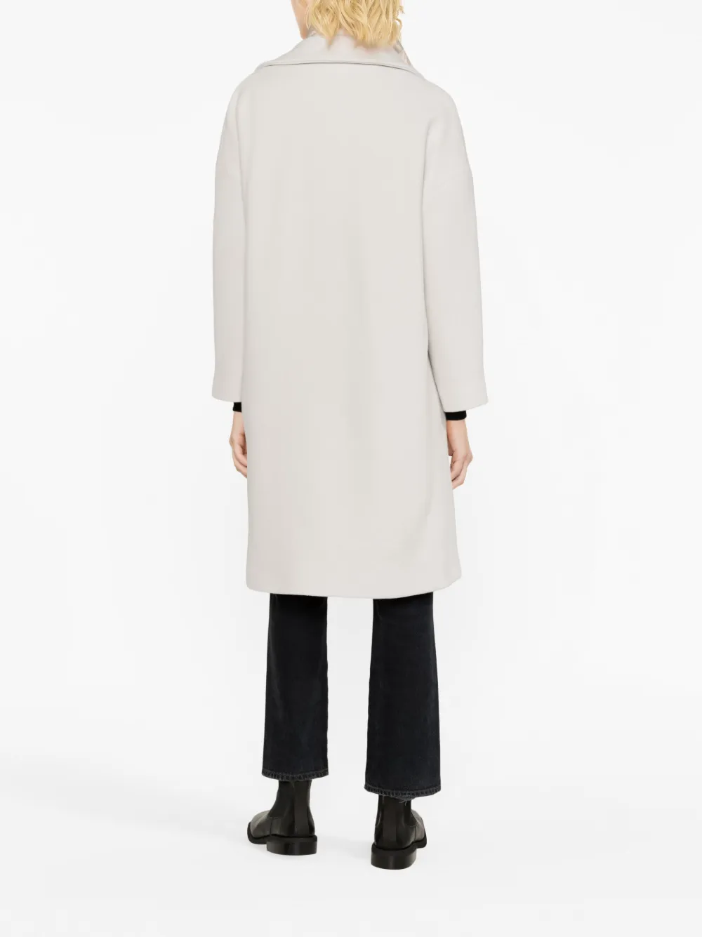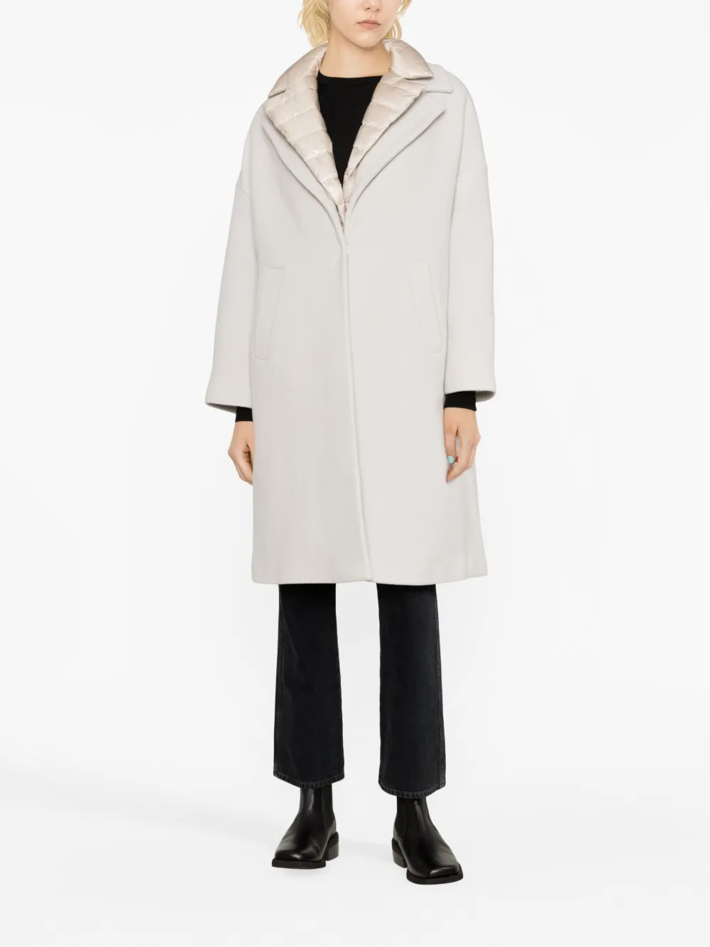Смесь хлопка и шерсти, наполнитель из пуха и перьев, стеганая модель, двусторонний дизайн, зазубренные лацканы, застежка на пуговицах спереди, два вшитых кармана по бокам, длинные рукава и прямой подол