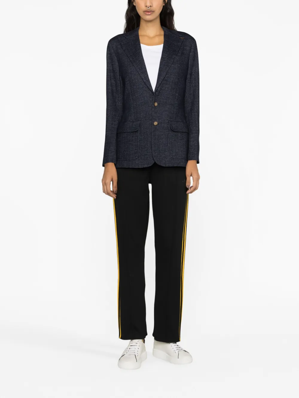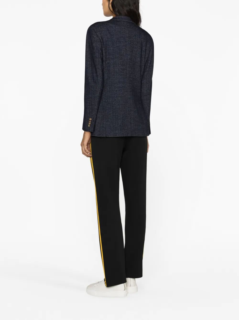 Индиго, смесь шерсти и хлопка, узор в елочку, зазубренные лацканы, застежка на пуговицах спереди, длинные рукава, манжеты на пуговицах, прорезной карман на груди, два передних кармана с клапанами и прямой подол