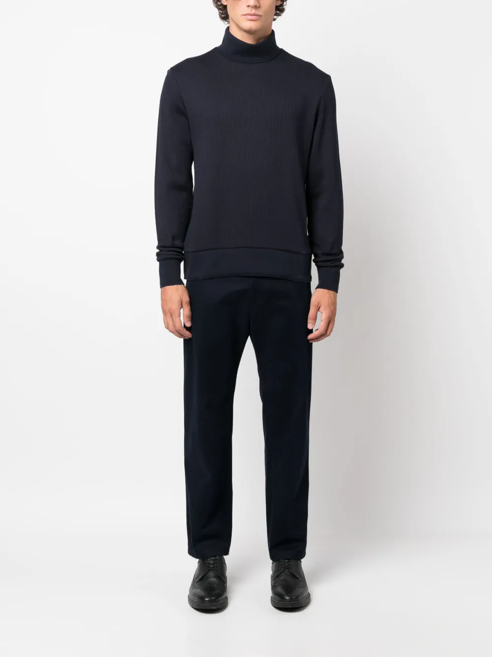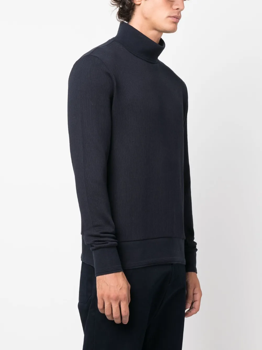 Темно-синий, хлопок, трикотажный материал, нашивка с логотипом спереди, знаковая деталь в полоску, высокий воротник и длинные рукава