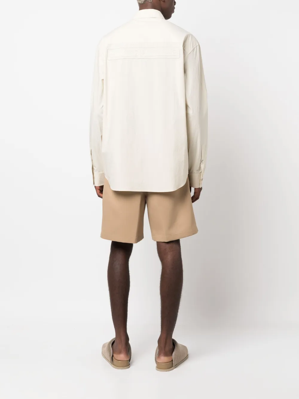 Светло-бежевый, хлопок, вышитый логотип сзади, классический воротник, застежка на пуговицах спереди, длинные рукава, манжеты на пуговицах, нагрудный накладной карман и закругленный подол