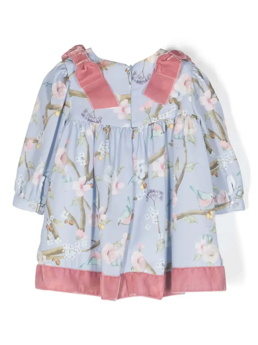 Голубой, разноцветный, хлопок, велюровая ткань, сплошной цветочный принт, бант, круглый вырез, застежка на молнии сзади, длинные рукава, манжеты на пуговицах, плиссированная юбка и прямой подол