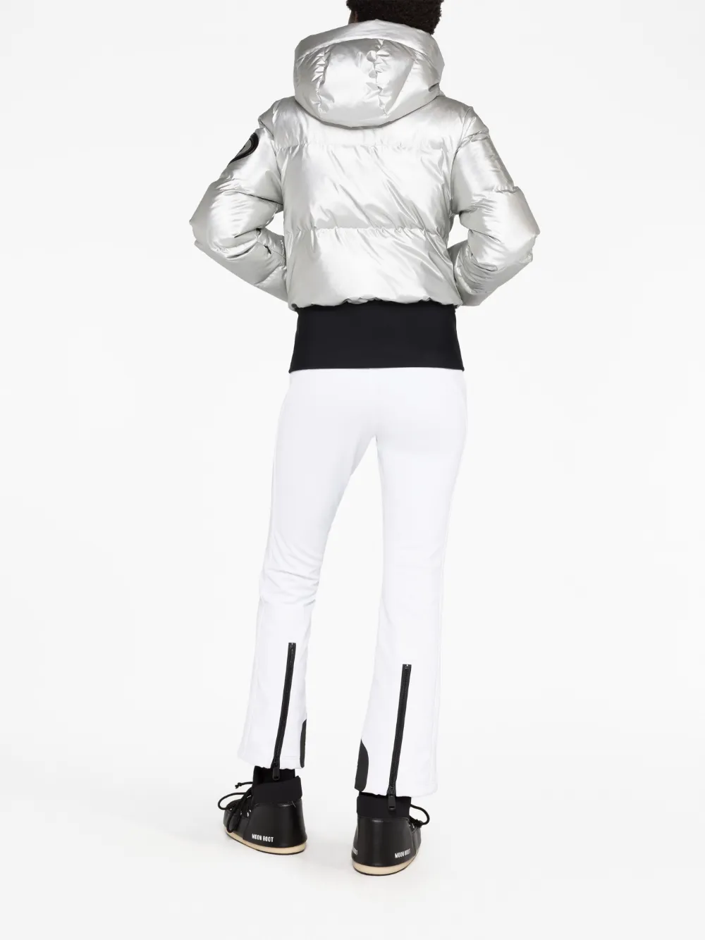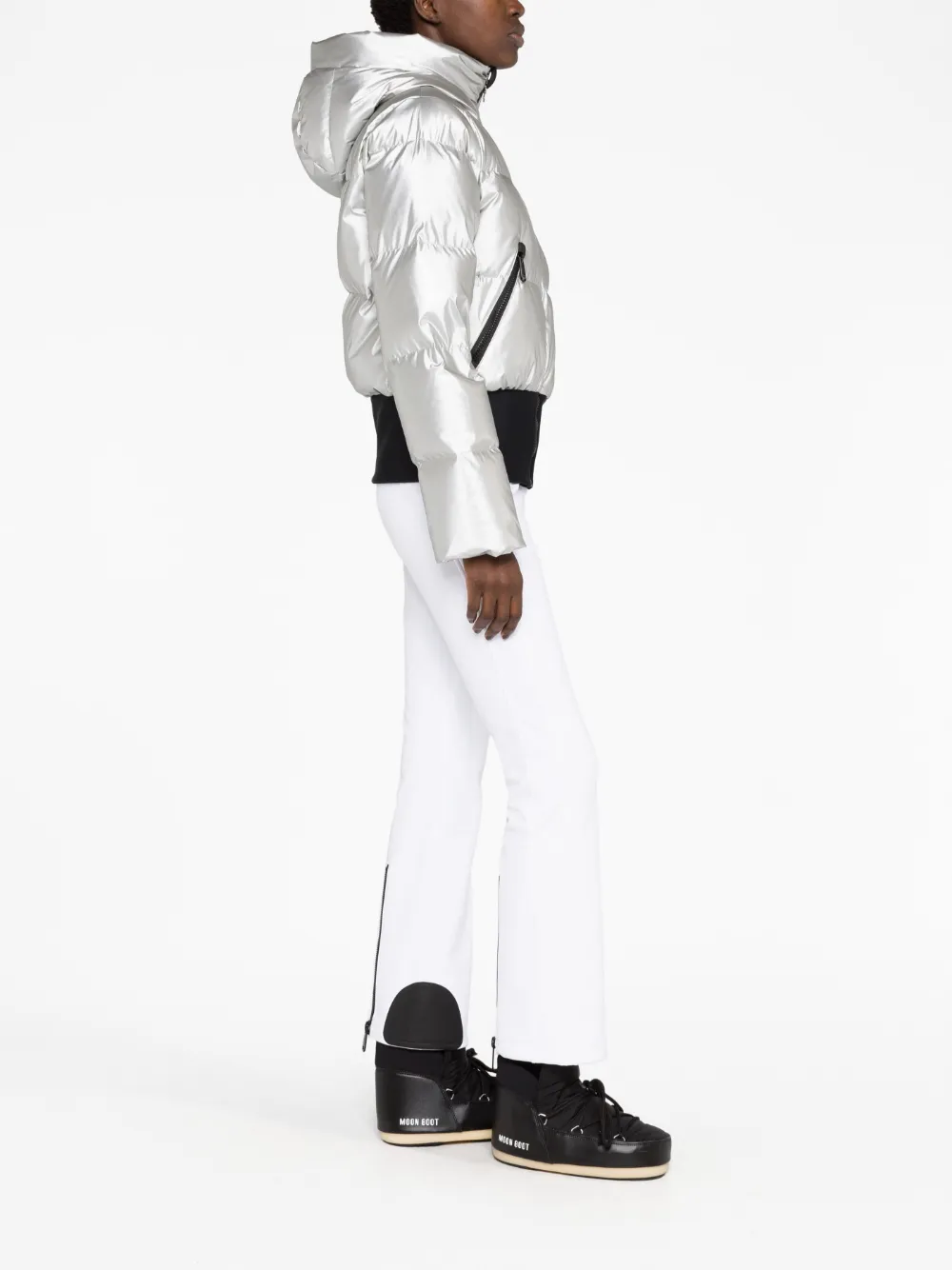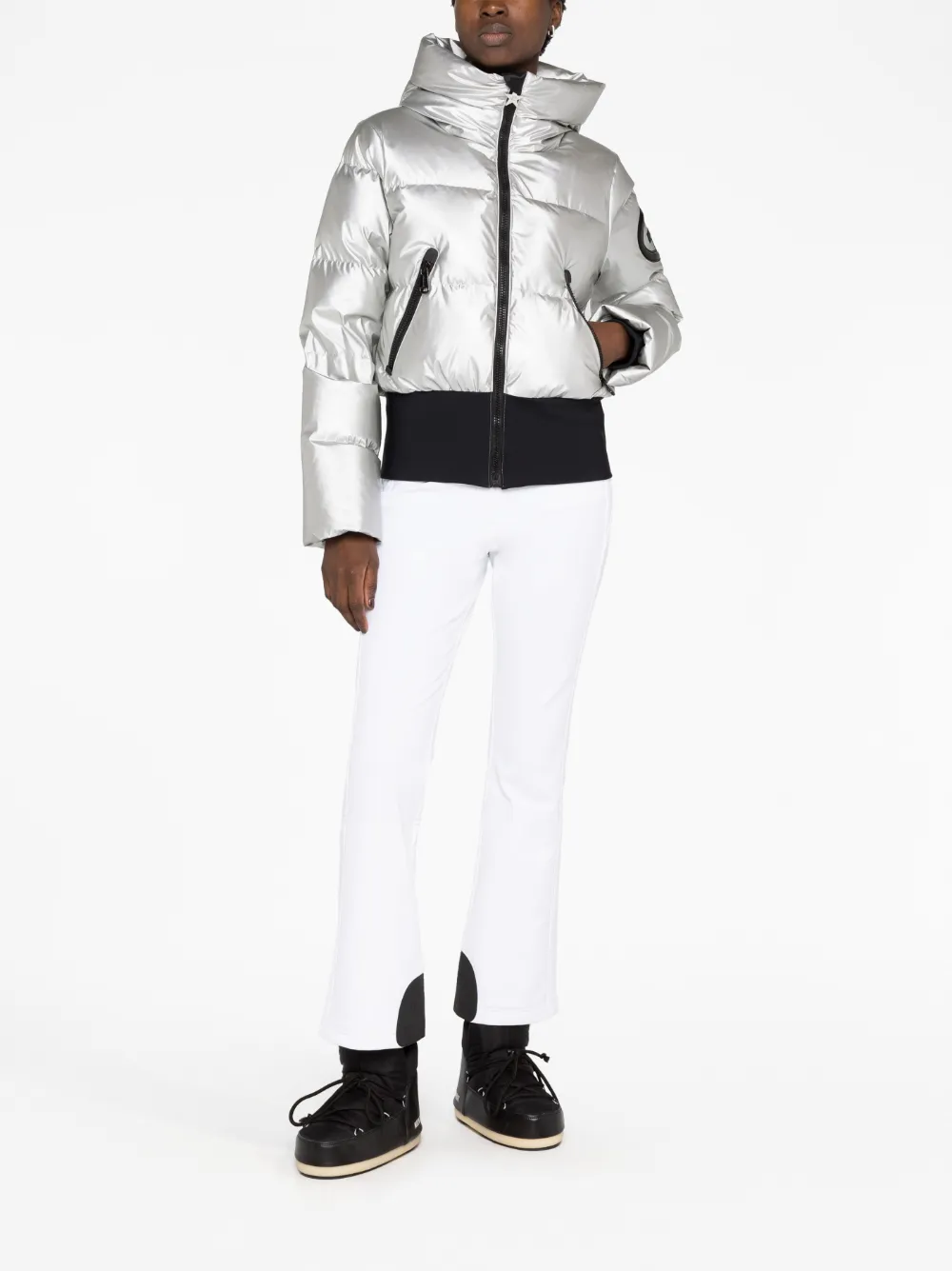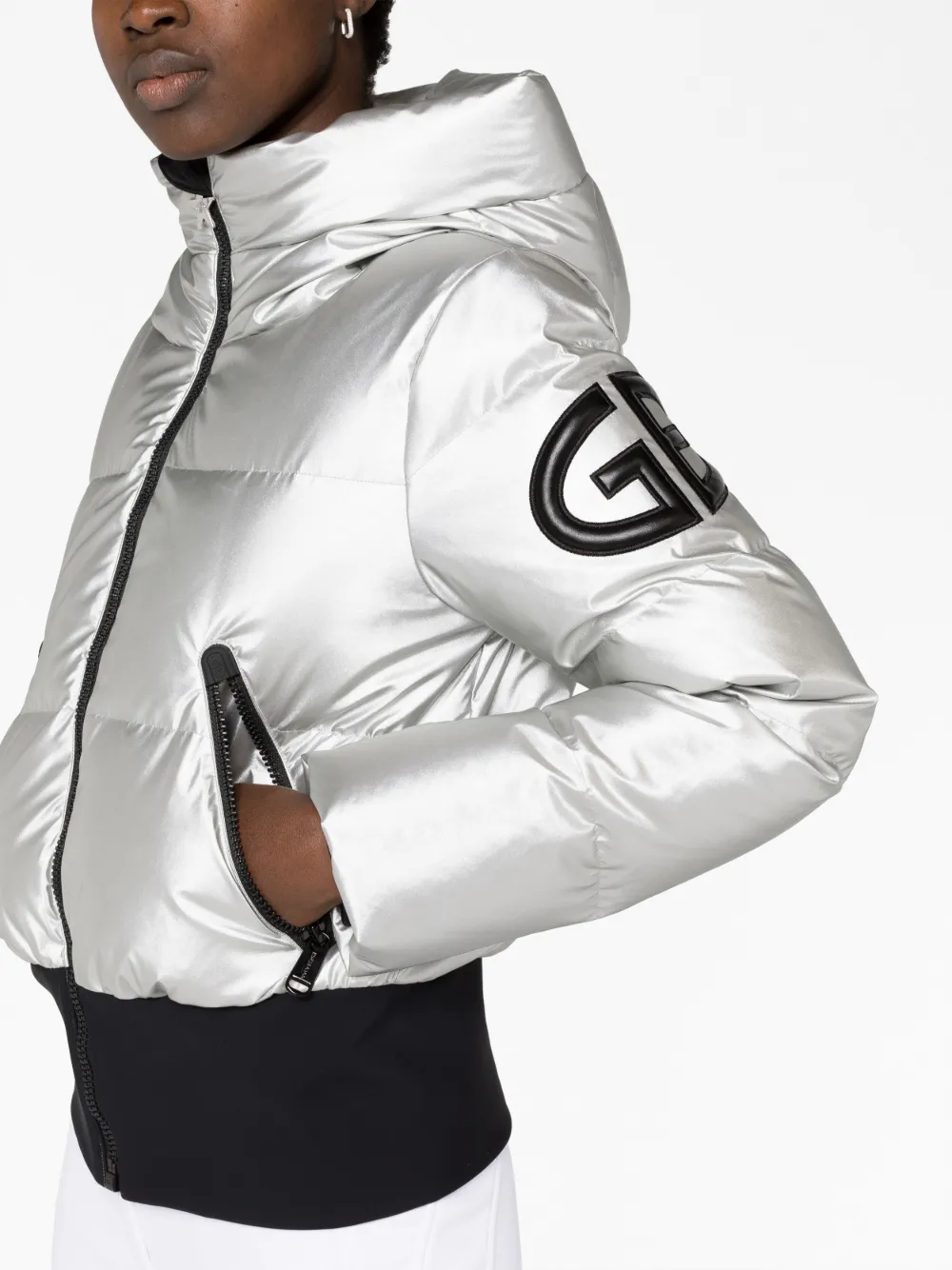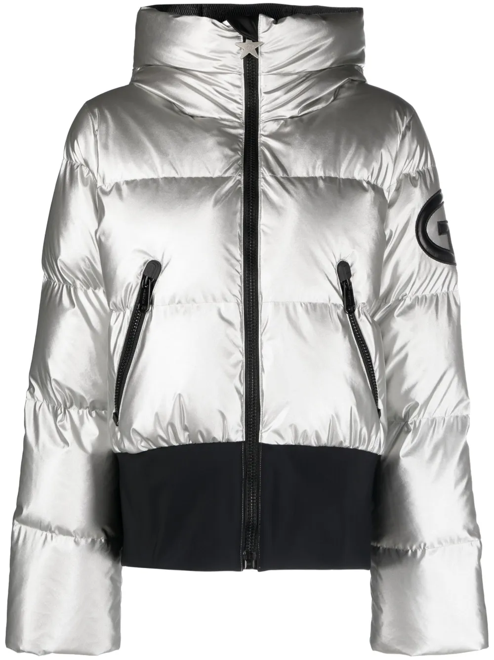 Серебристый, черный, наполнитель из смеси пуха и пера, дутый материал, стеганая модель, эффект металлик, нашивка с логотипом на рукаве, классический капюшон, высокий воротник, застежка на молнии спереди, длинные рукава, два кармана на молнии по бокам и прямой подол