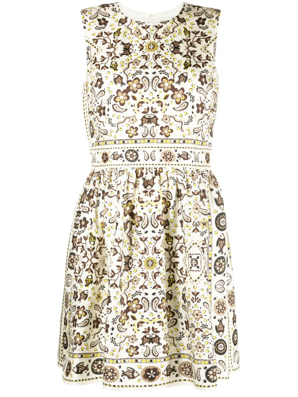 Кремово-белый, коричневый, шелк, сплошной графичный принт, круглый вырез, потайная застежка на молнии сзади, без рукавов, длина до бедер и прямой подол