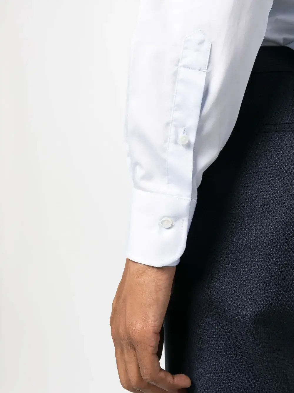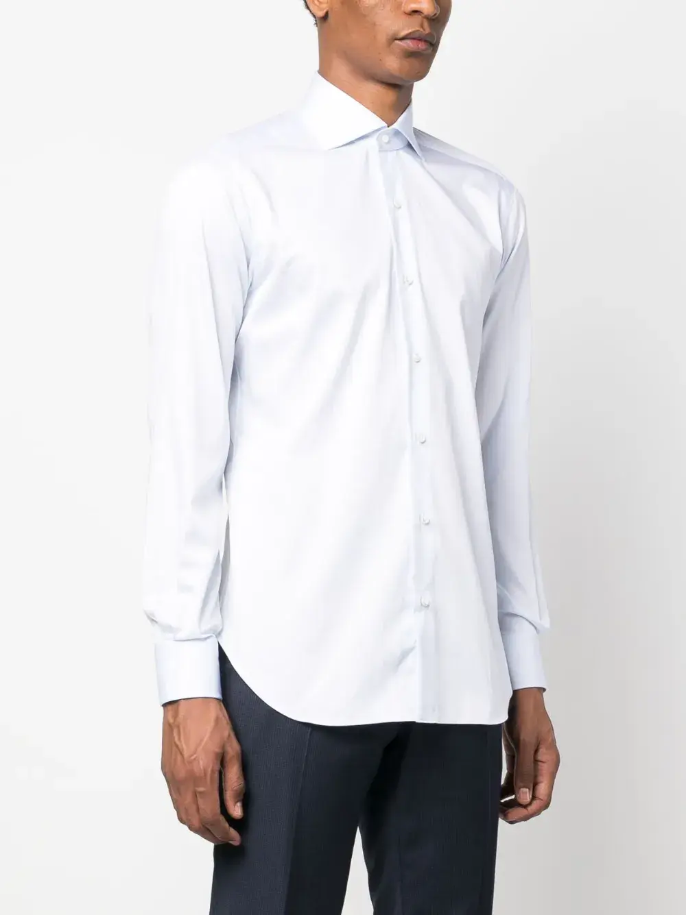 Голубой, хлопок, косой воротник, застежка на пуговицах спереди, длинные рукава, манжеты на пуговицах и закругленный подол