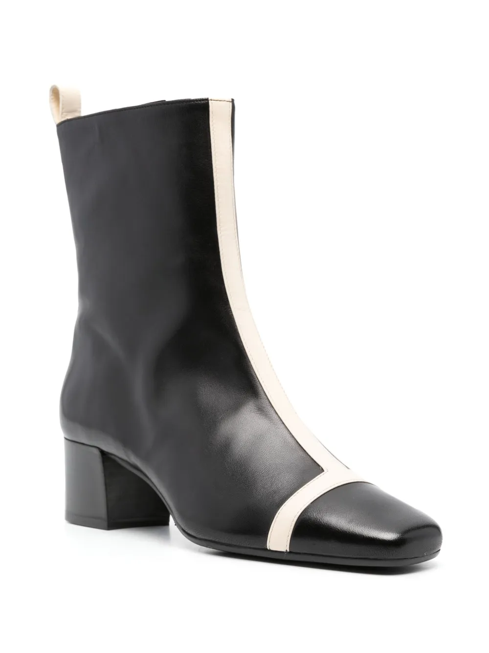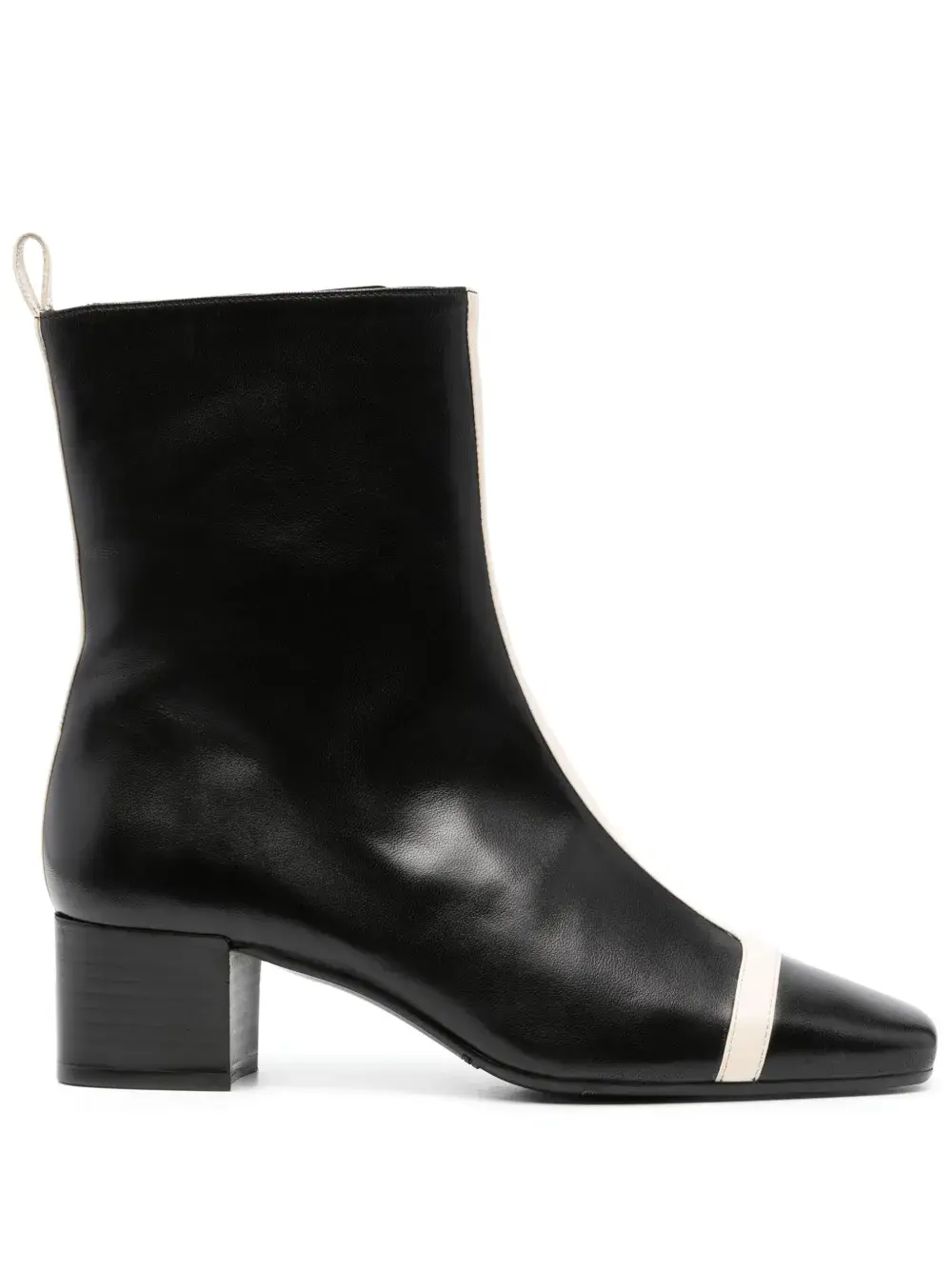 Черный/белый, телячья кожа, контрастная отделка, миндалевидный носок, застежки на молнии сбоку, стелька с логотипом и блочный каблук средней высоты