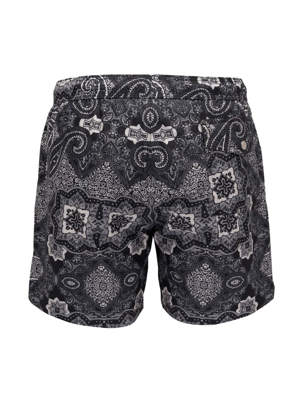 Черный/белый, подкладка в полоску, принт пейсли, логотип-аппликация, кулиска на талии, карман на пуговице сзади и длина до бедер