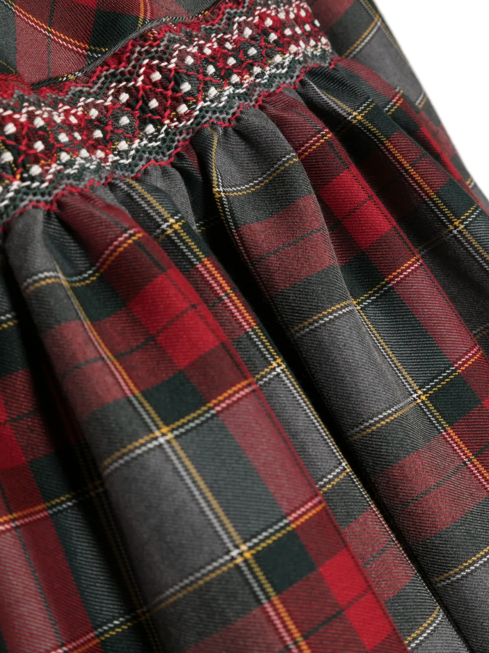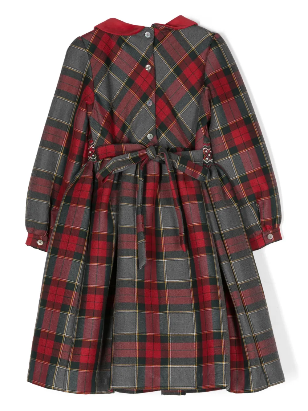 Серый, разноцветный, хлопок, узор в клетку тартан, вставки, вышитый узор, воротник Питер Пэн, длинные рукава, эластичные манжеты, застежка на пуговицы сзади, завязка на бант сзади, юбка А-образного силуэта и прямой подол