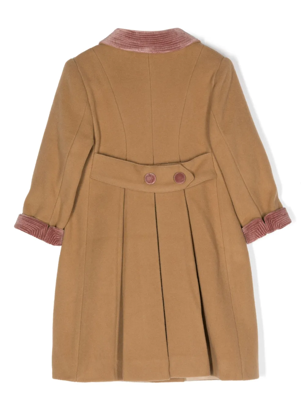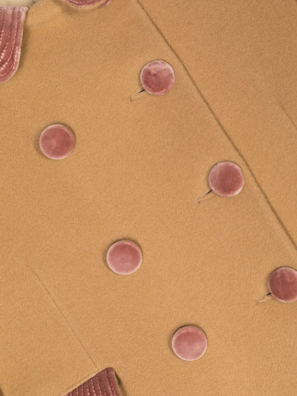 Бежевый, необработанная шерсть, бархатный эффект, закругленный воротник, двубортная застежка на кнопки, два передних кармана с клапанами, длинные рукава, контрастные манжеты и прямой подол