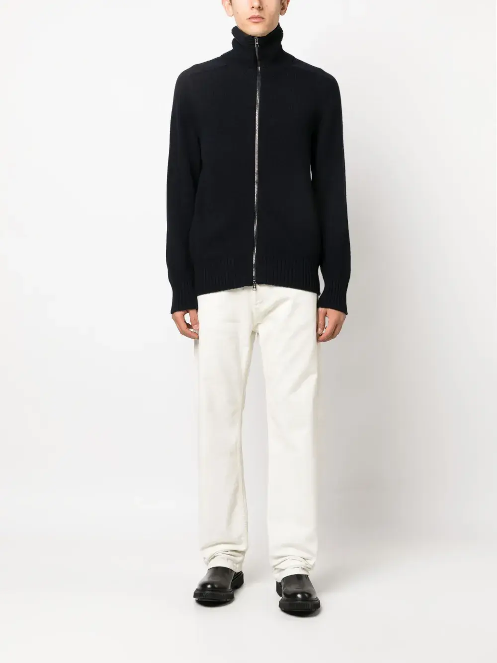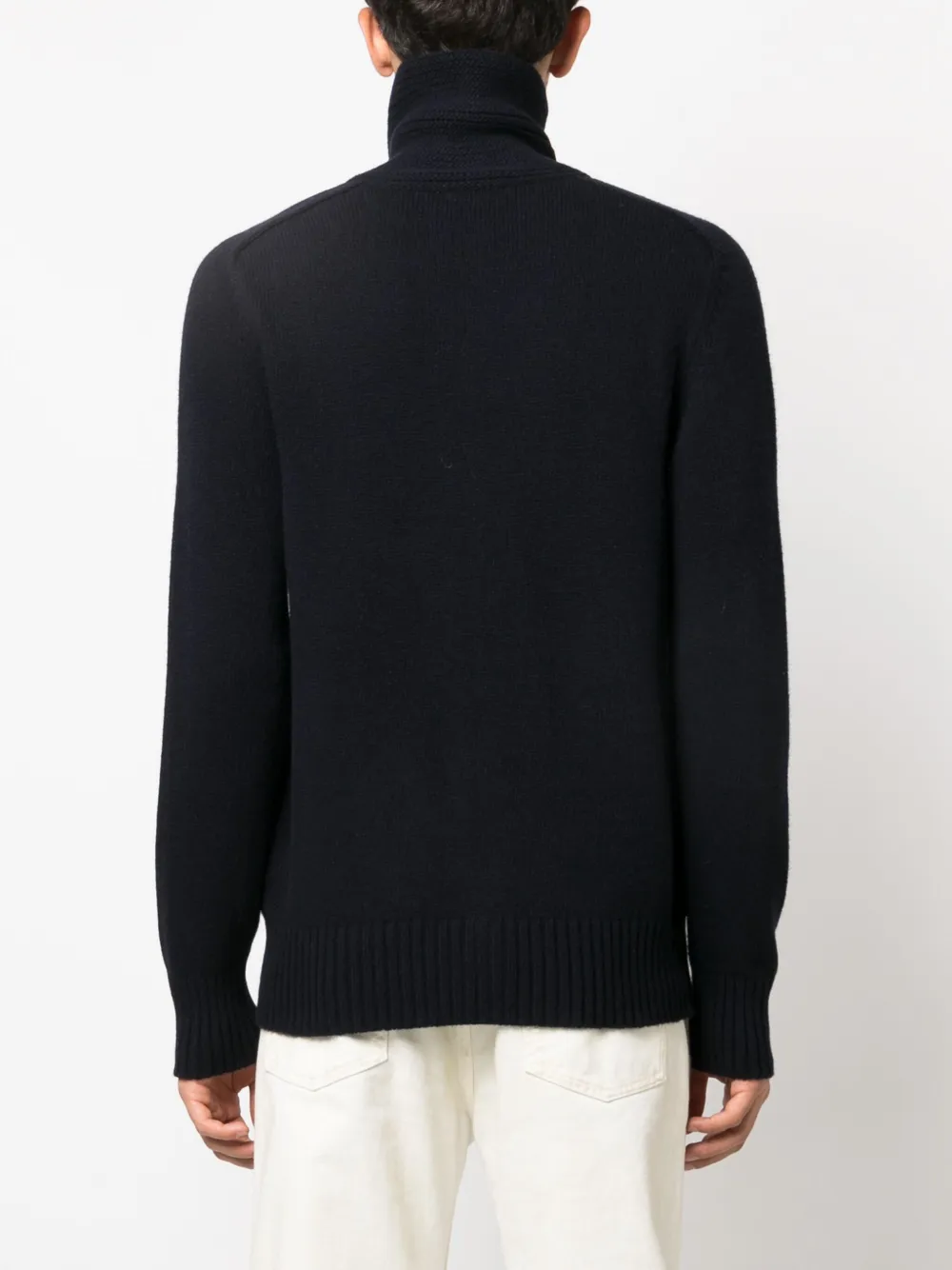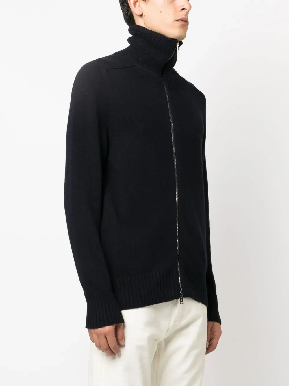 Темно-синий, смесовая шерсть, трикотажный материал, высокий воротник, застежка на молнии спереди, длинные рукава и прямой подол