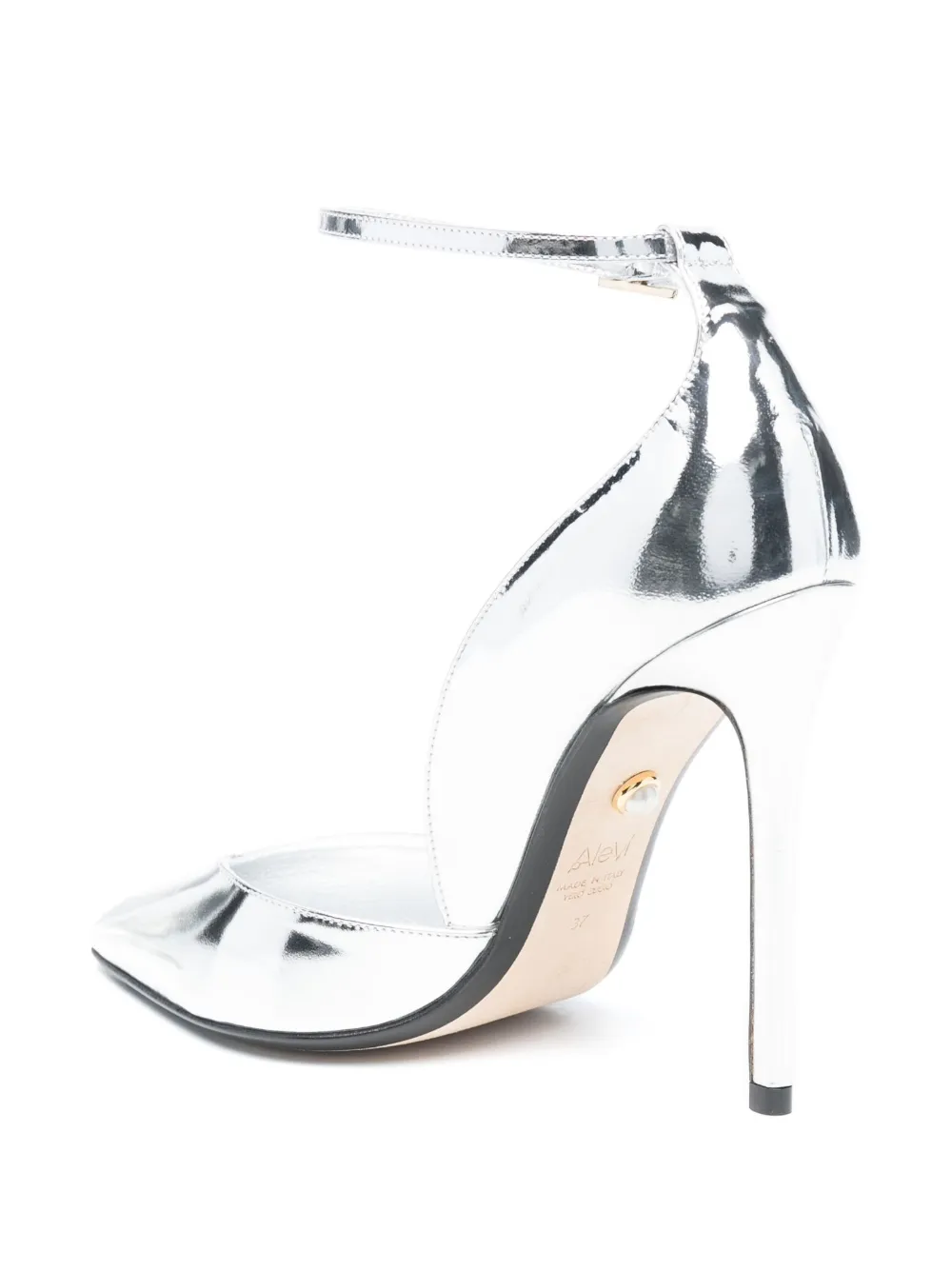 Серебристый, телячья кожа, зеркало, искусственный жемчуг, заостренный носок, ремешок на щиколотке с пряжкой, кожаная стелька с логотипом, каблук на высокой шпильке и кожаная подошва