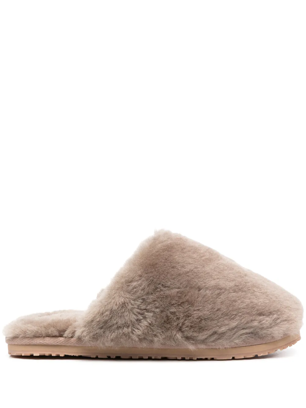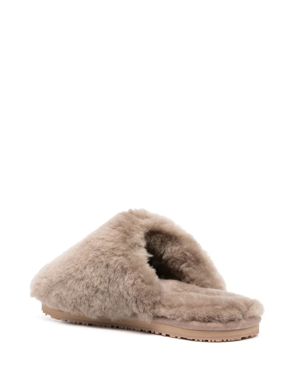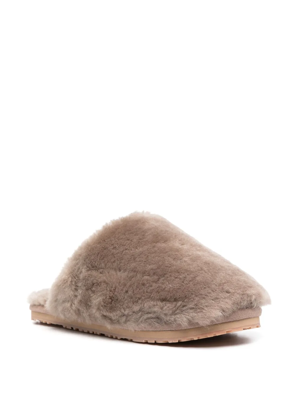 Серо-коричневый, овечья кожа, закругленный носок, модель без застежки, стелька с логотипом, плоская резиновая подошва и подкладка из овечьей шерсти