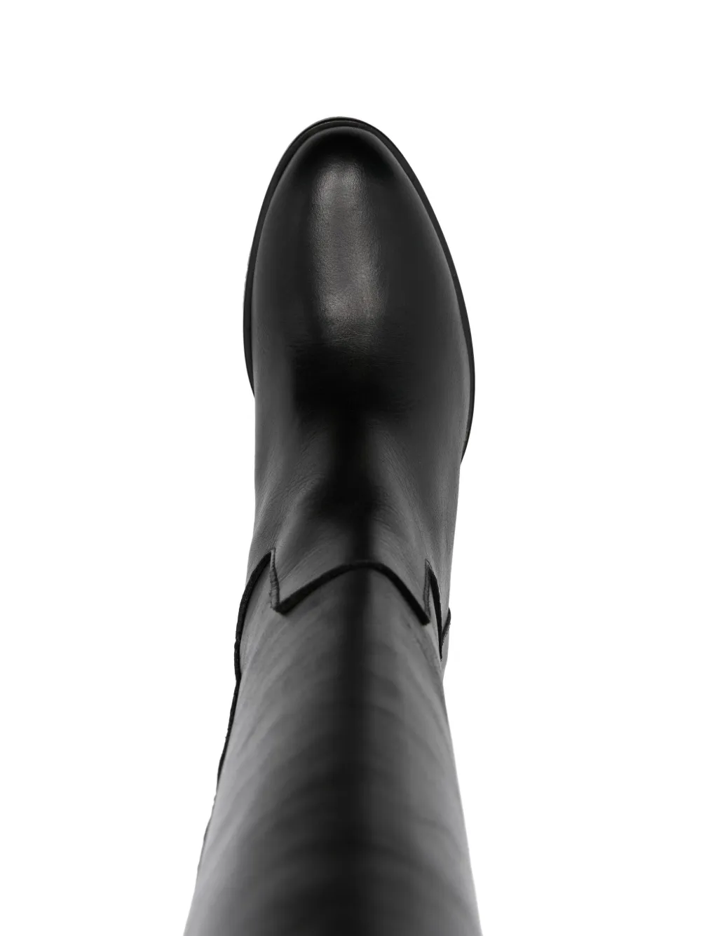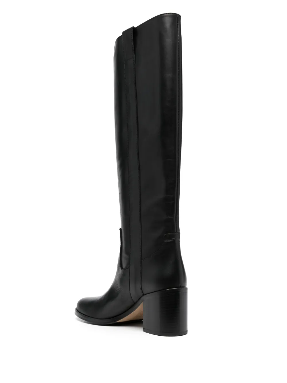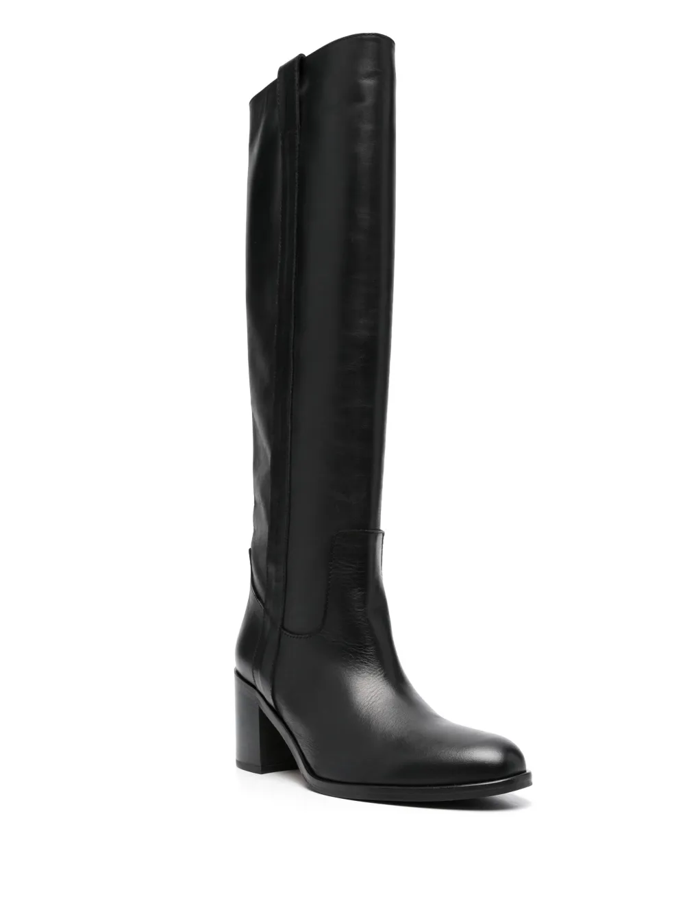 Черный, телячья кожа, миндалевидный носок, гладкая текстура кожи, высота по колено, модель без застежки и блочный каблук средней высоты