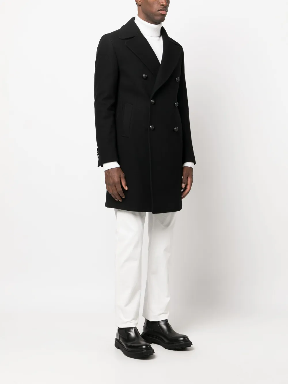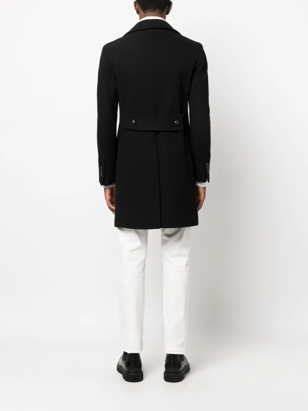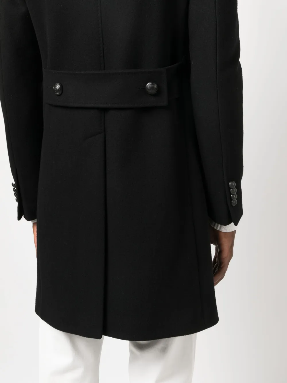 Черный, смесовая необработанная шерсть, двубортная застежка на кнопки, хлястик сзади, два прорезных кармана по бокам, длинные рукава, шлица по центру сзади и длина миди