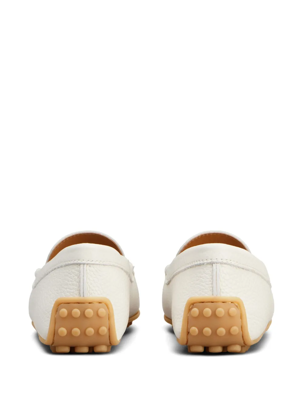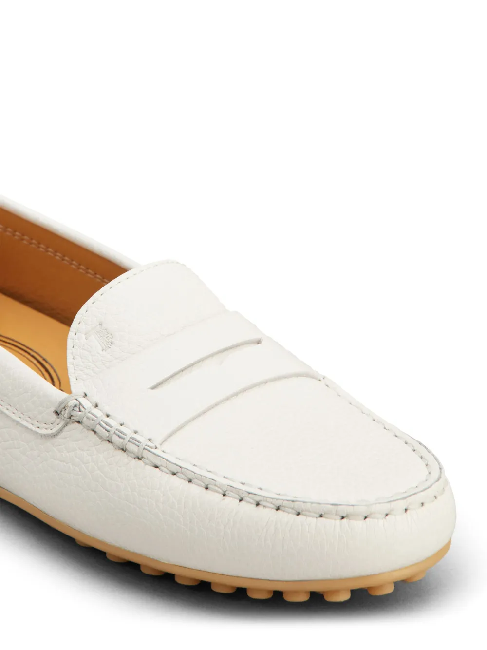 Белый, телячья кожа, зернистая текстура, объемная окантовка, прорези на язычке, закругленный носок, кожаная стелька с логотипом, модель без застежки и рифленая резиновая подошва