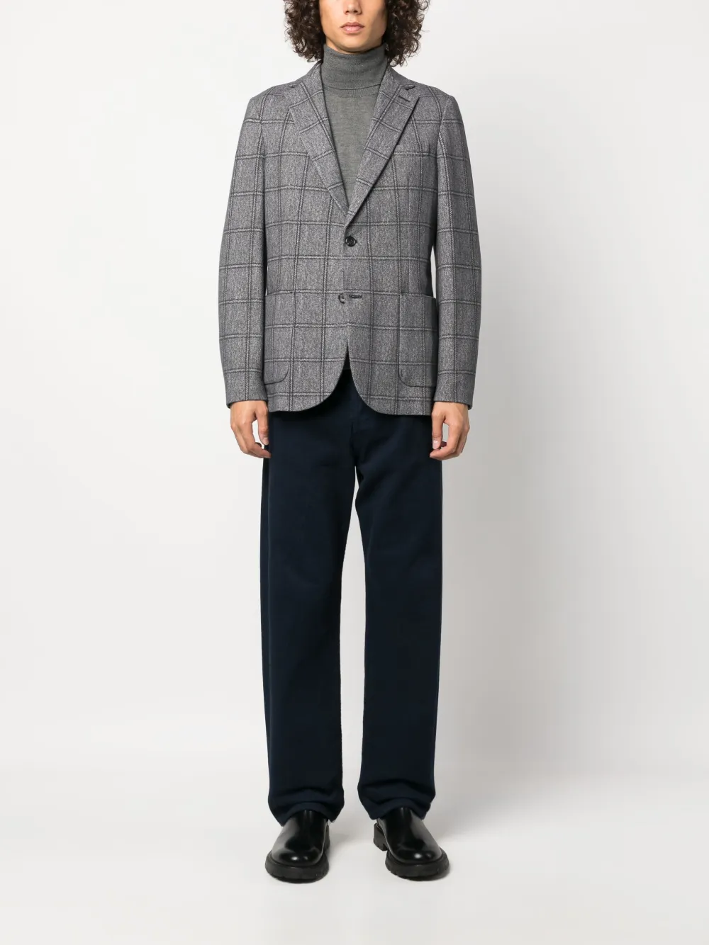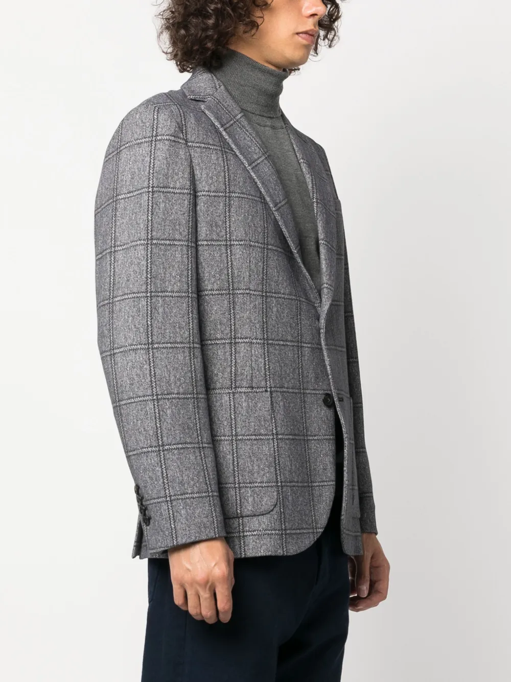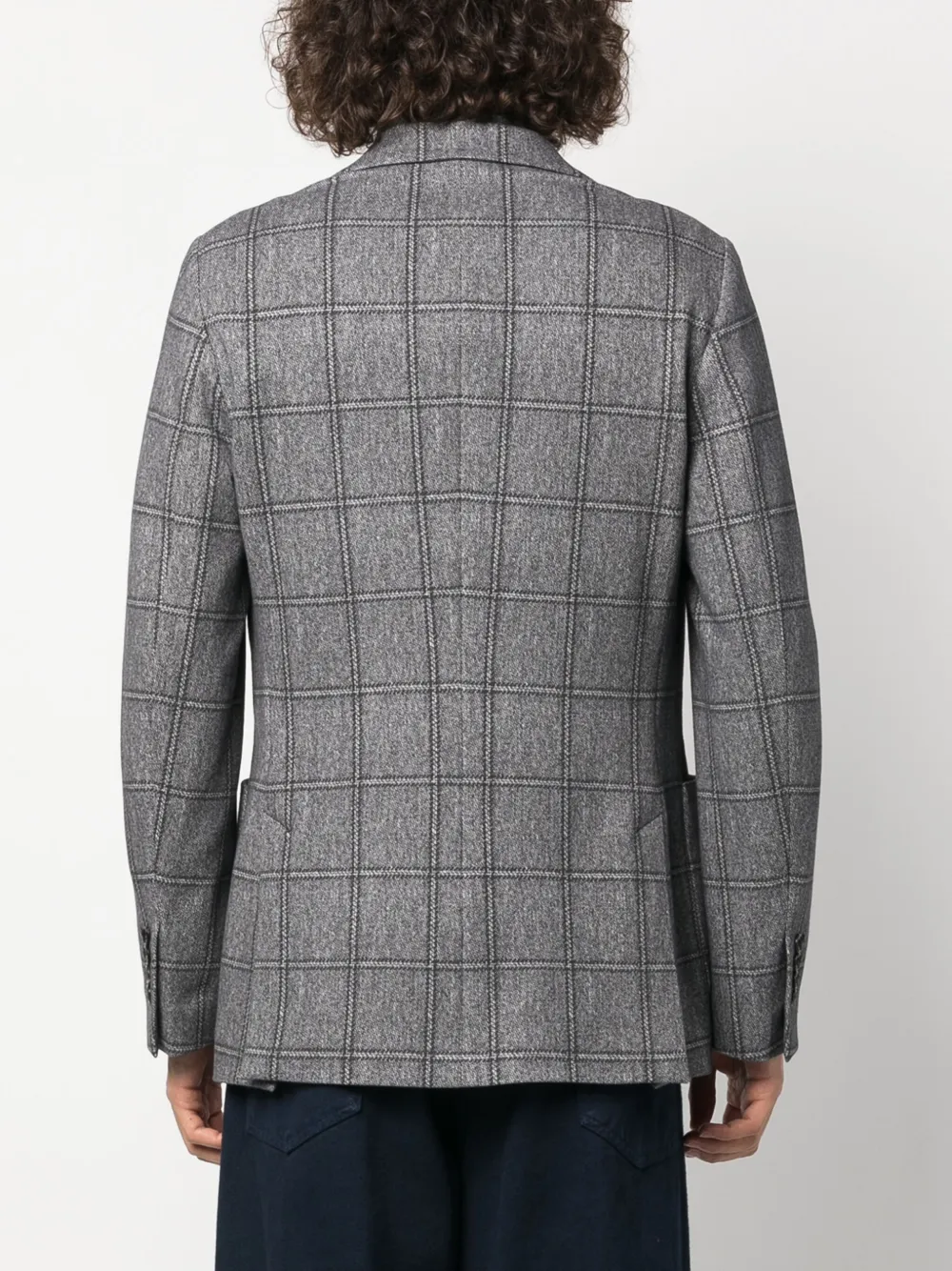 Темно-синий, эластичный хлопок, клетчатый узор, зазубренные лацканы, застежка на пуговицах спереди, длинные рукава, манжеты на пуговицах, прорезной карман на груди, две боковые шлицы сзади и прямой подол
