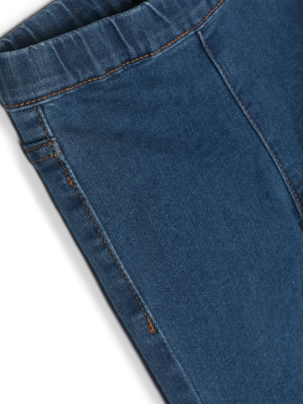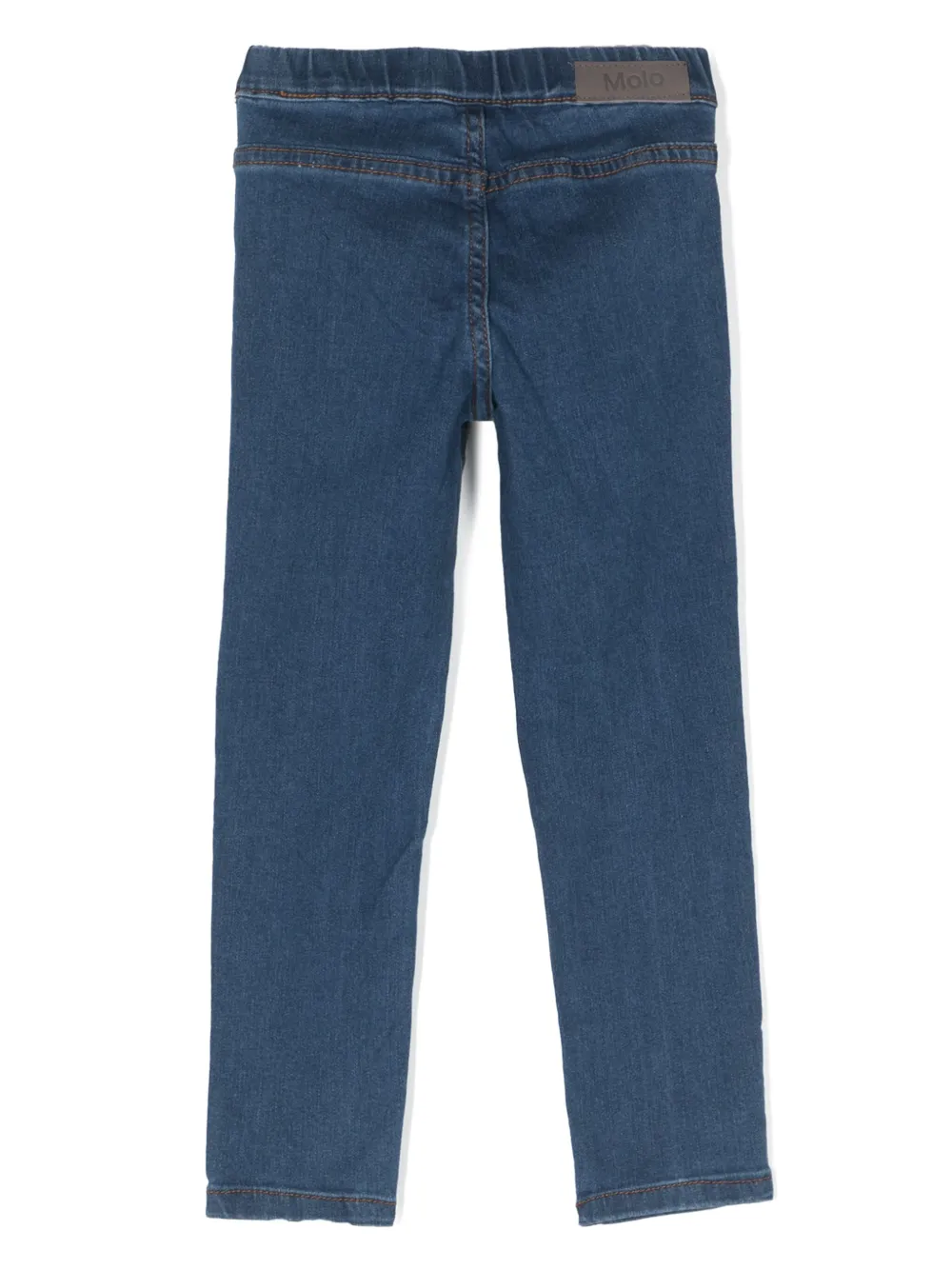 Индиго, смесовый хлопок, нашивка с логотипом сзади, эластичный пояс и узкий крой.