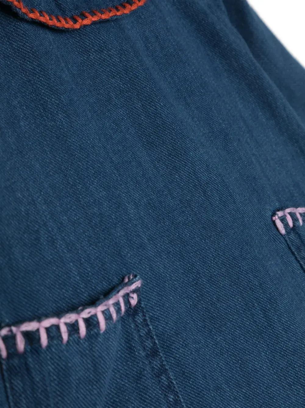 Индиго, разноцветный, хлопок, деним, цветочная вышивка, вышитый узор, обметочный шов, круглый вырез, воротник с оборками, застежка на молнии сзади, длинные рукава, эластичные манжеты, два накладных кармана спереди и прямой подол.