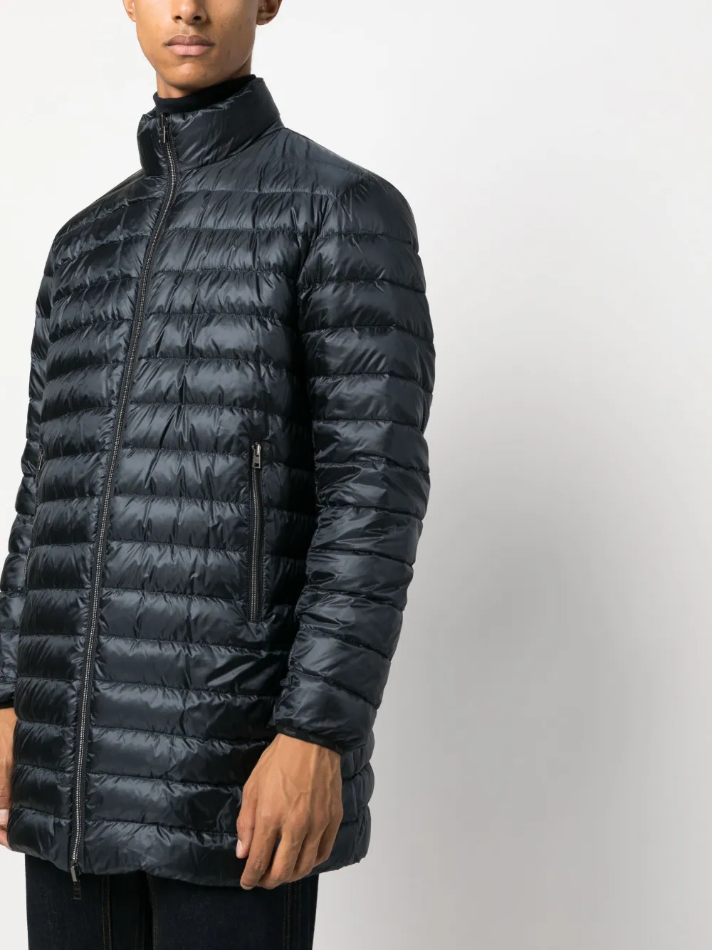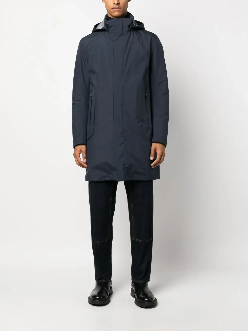 Темно-синий, наполнитель из смеси пуха и пера, двусторонний дизайн, объемный капюшон, высокий воротник, потайная застежка спереди, длинные рукава и два кармана на молнии