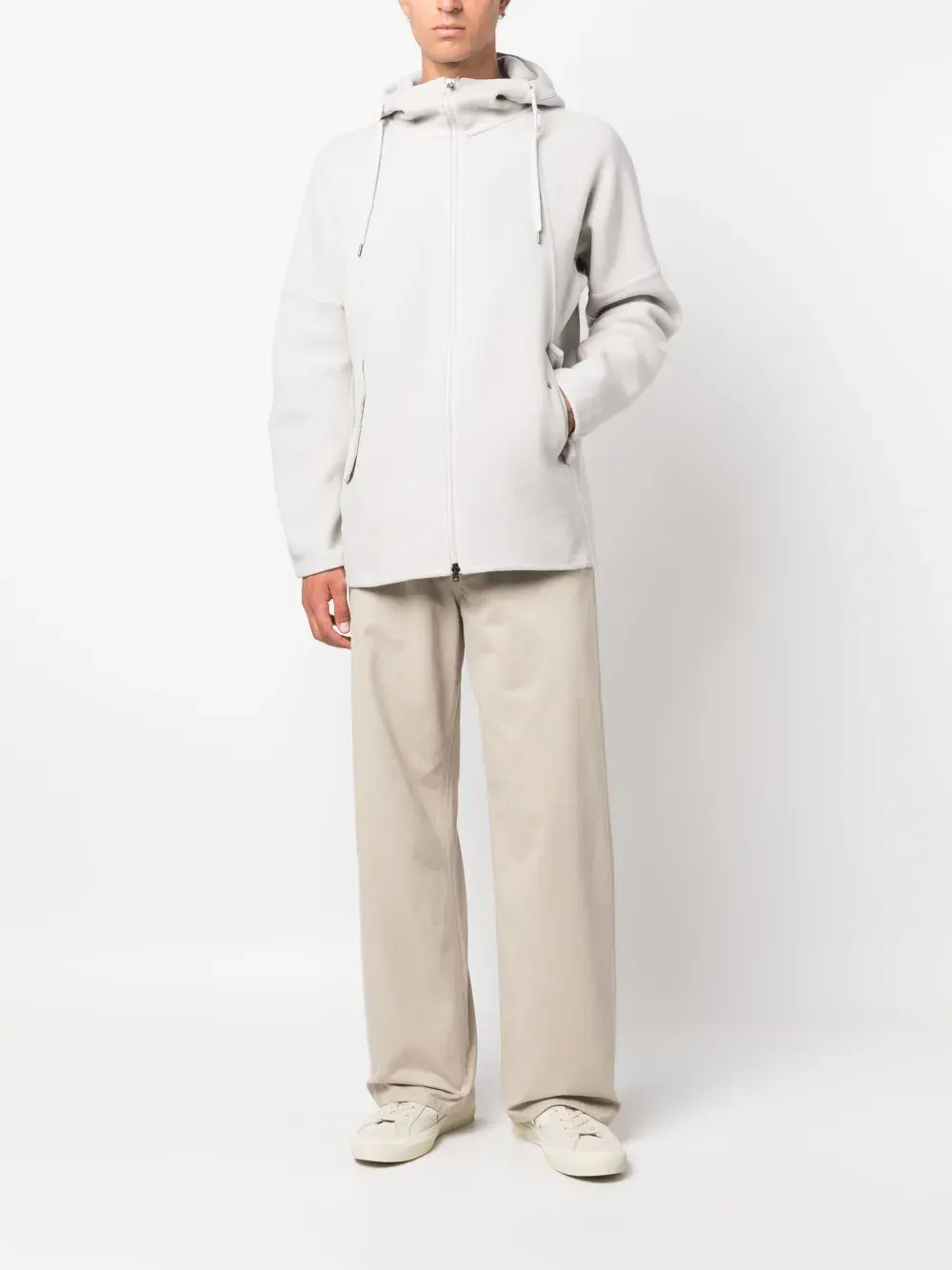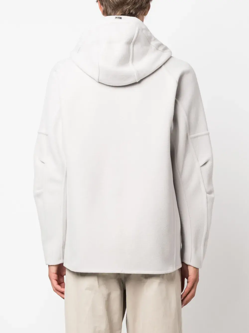 Серый/белый, смесовая необработанная шерсть, затягивающийся на шнурок капюшон, двусторонняя молния спереди, приспущенные плечи, длинные рукава, два кармана на кнопке по бокам и прямой подол