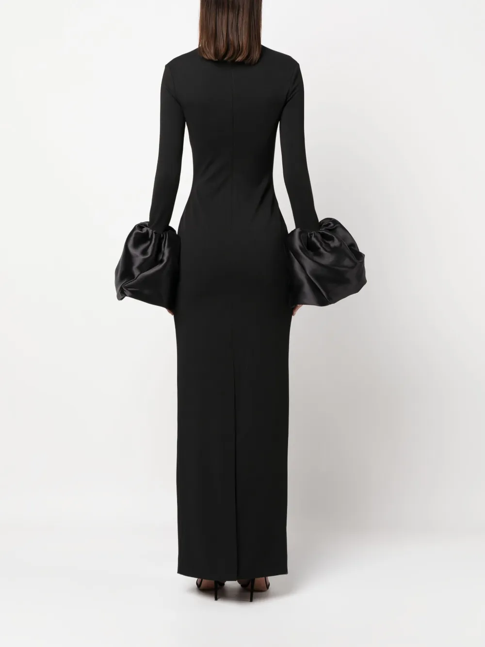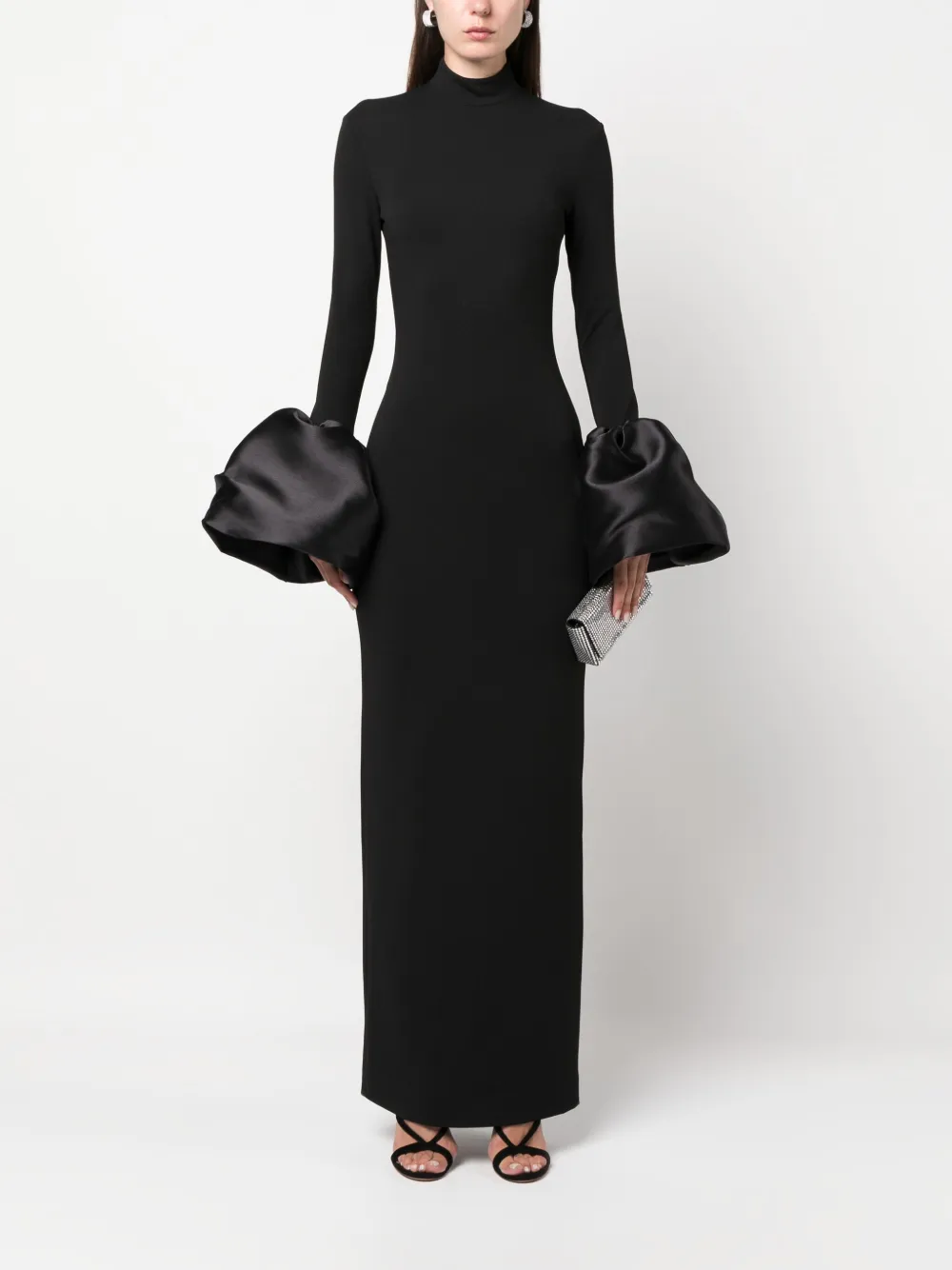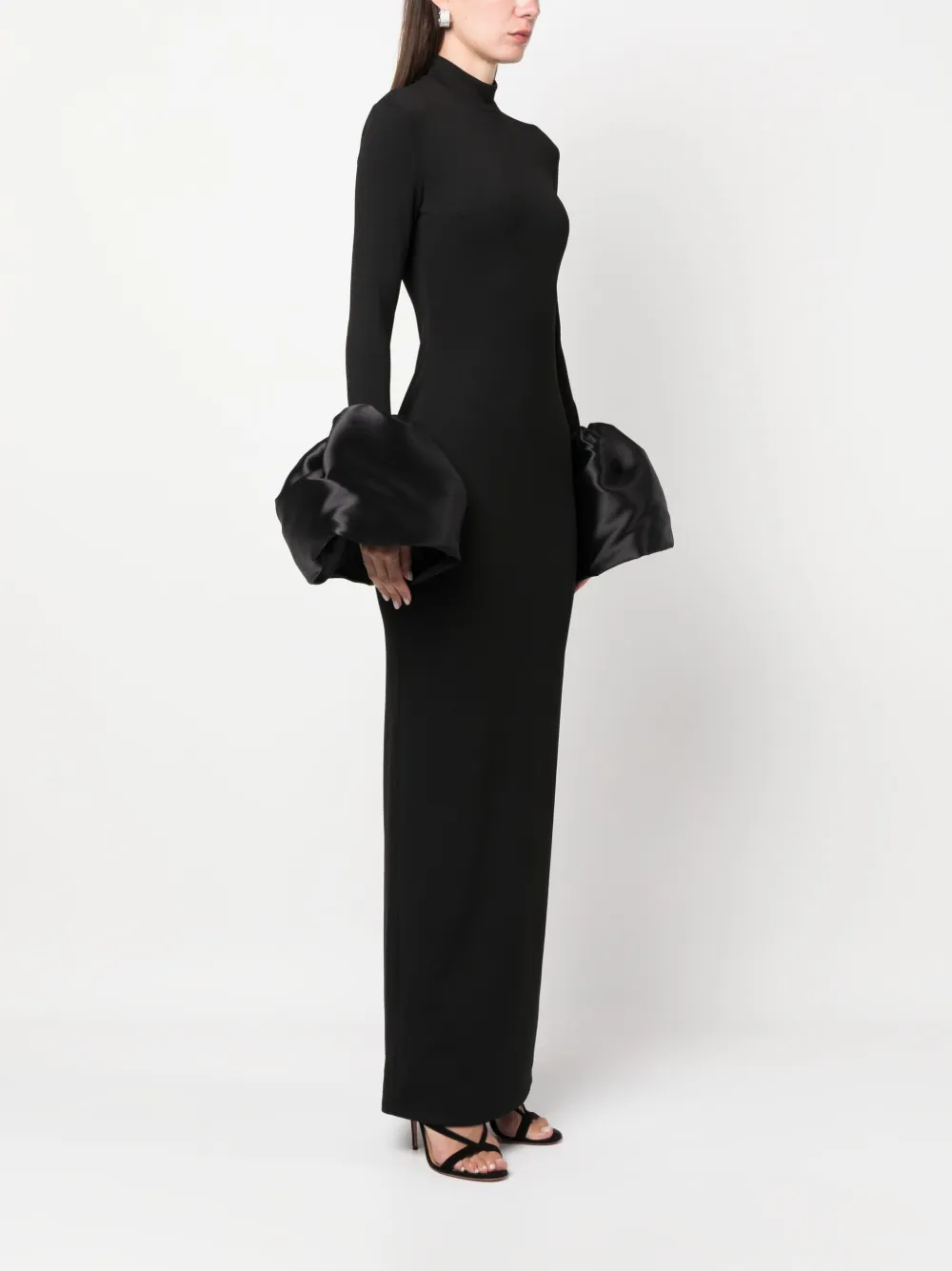 Черный, эластичный материал, ткань сатин-дюшес, высокий воротник, застежка на молнии сзади, длинные рукава, расклешенные манжеты, высота по щиколотку и прямой подол