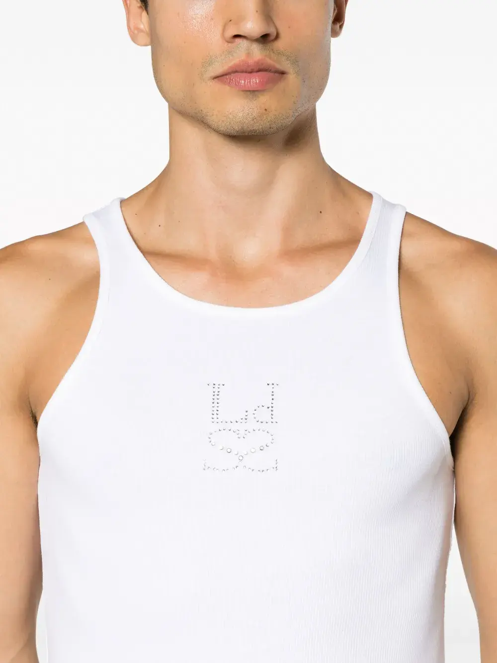 Белый, стрейчевый органический хлопок, отделка кристаллами Swarovski, U-образный вырез, без рукавов и прямой подол.