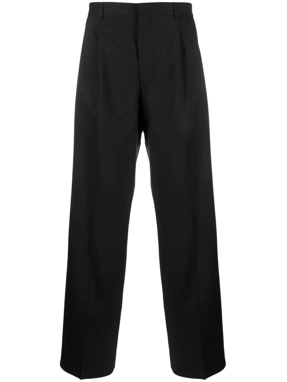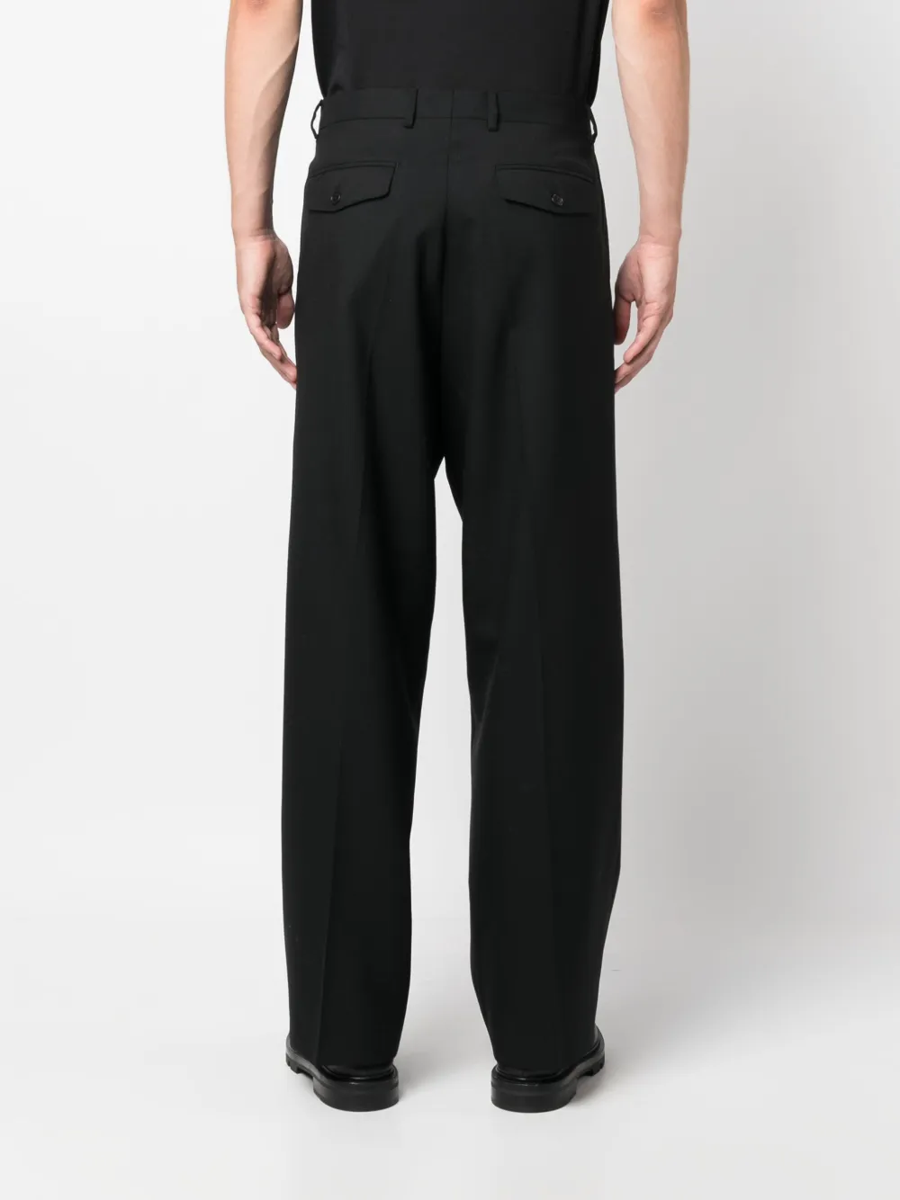 Черный, шерсть, классический крой, складки, петли для ремня, средняя посадка, потайная застежка спереди, два вшитых кармана по бокам, два кармана на пуговице сзади и зауженный крой.