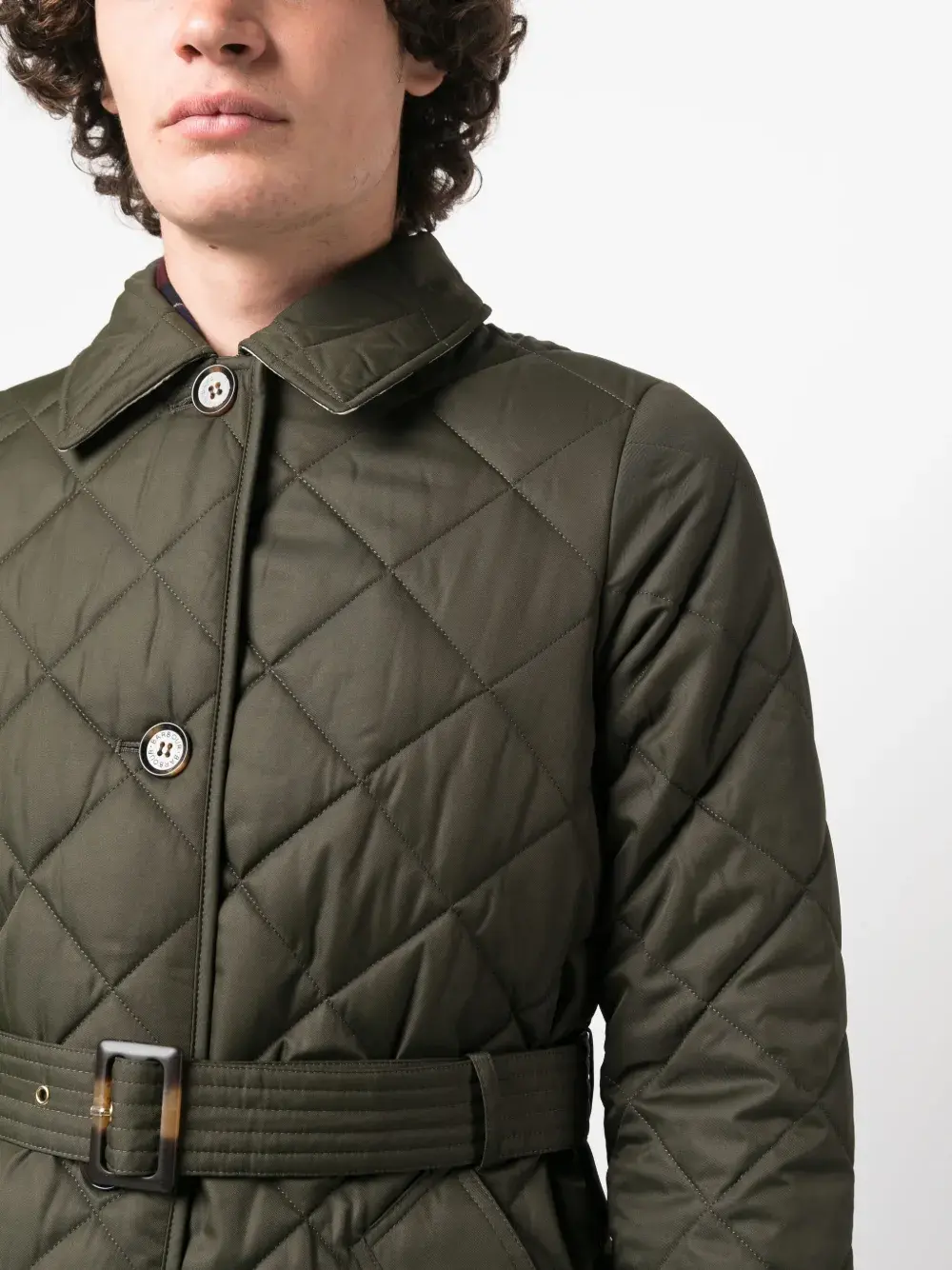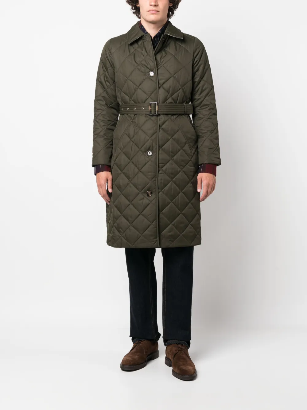 Хаки, стеганый материал, отложной воротник, застежка на пуговицах спереди, ремень на талии, длинные рукава, длина выше колена и прямой подол