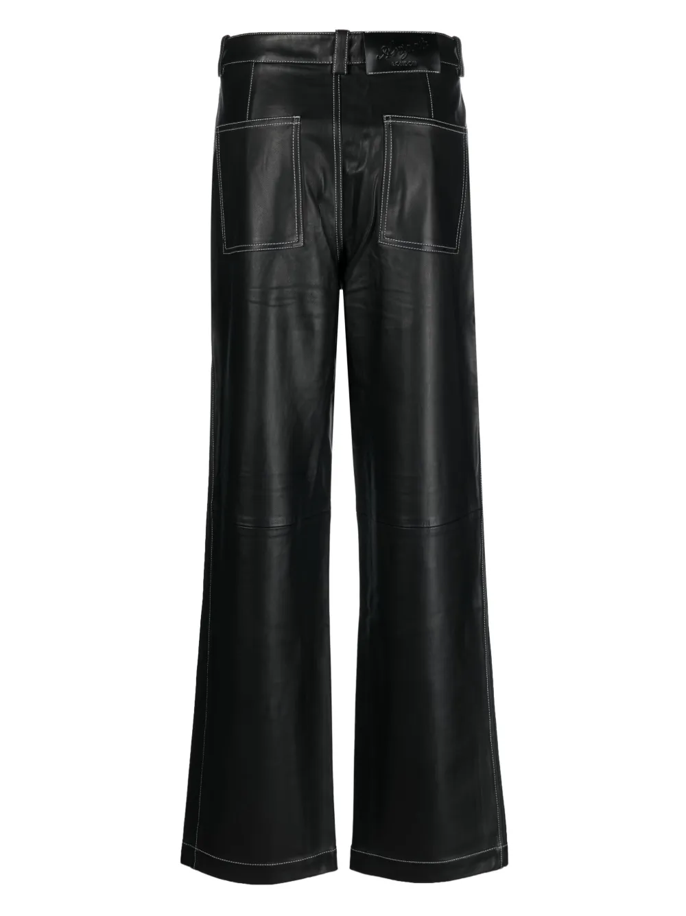 Черный, овечья кожа, контрастная строчка, нашивка с логотипом сзади, петли для ремня, потайная застежка на молнии и пуговицах, пять карманов, подкладка из хлопка и прямой крой.