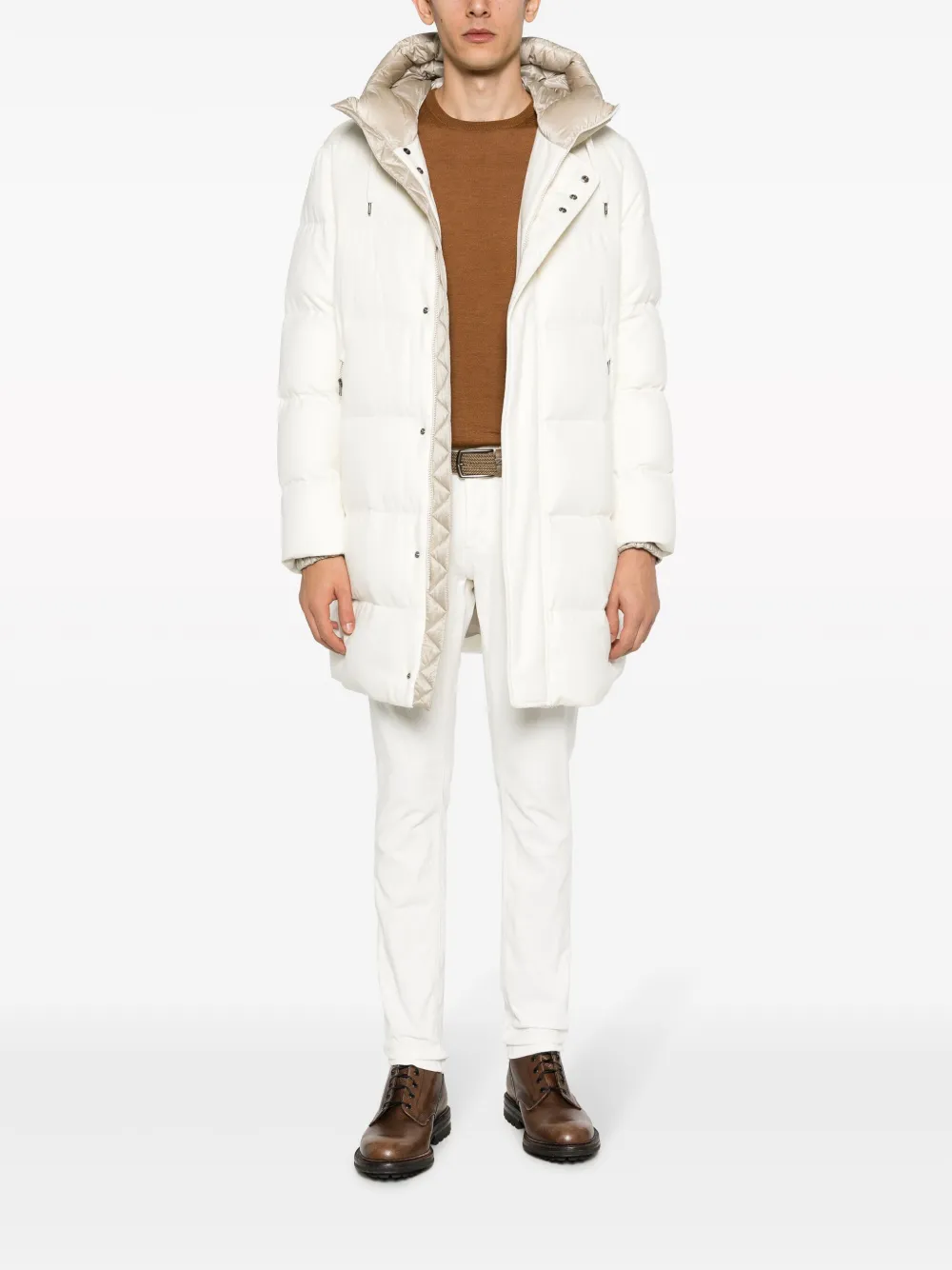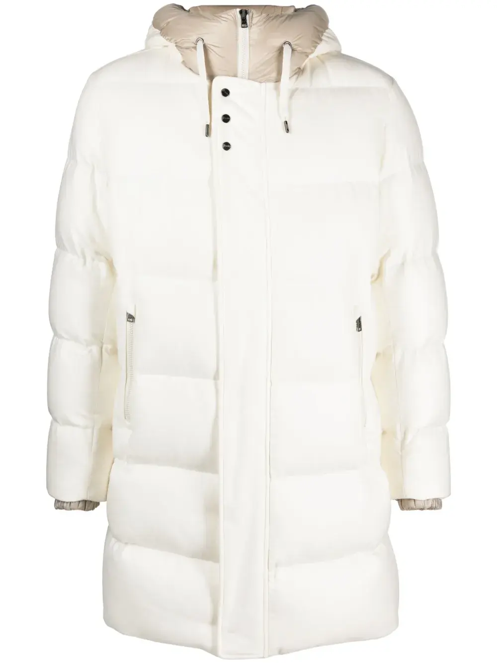 Подробнее о товаре: Белый, песочно-бежевый, смесь кашемира и шелка, наполнитель из смеси пуха и пера, ткань с твиловым переплетением, стеганая отделка, серебристый металлический логотип, затягивающийся на шнурок капюшон, воротник-труба, потайная застежка на кнопках спереди, длинные рукава, эластичные манжеты, два кармана на молнии по бокам, прямой подол и длина по колено