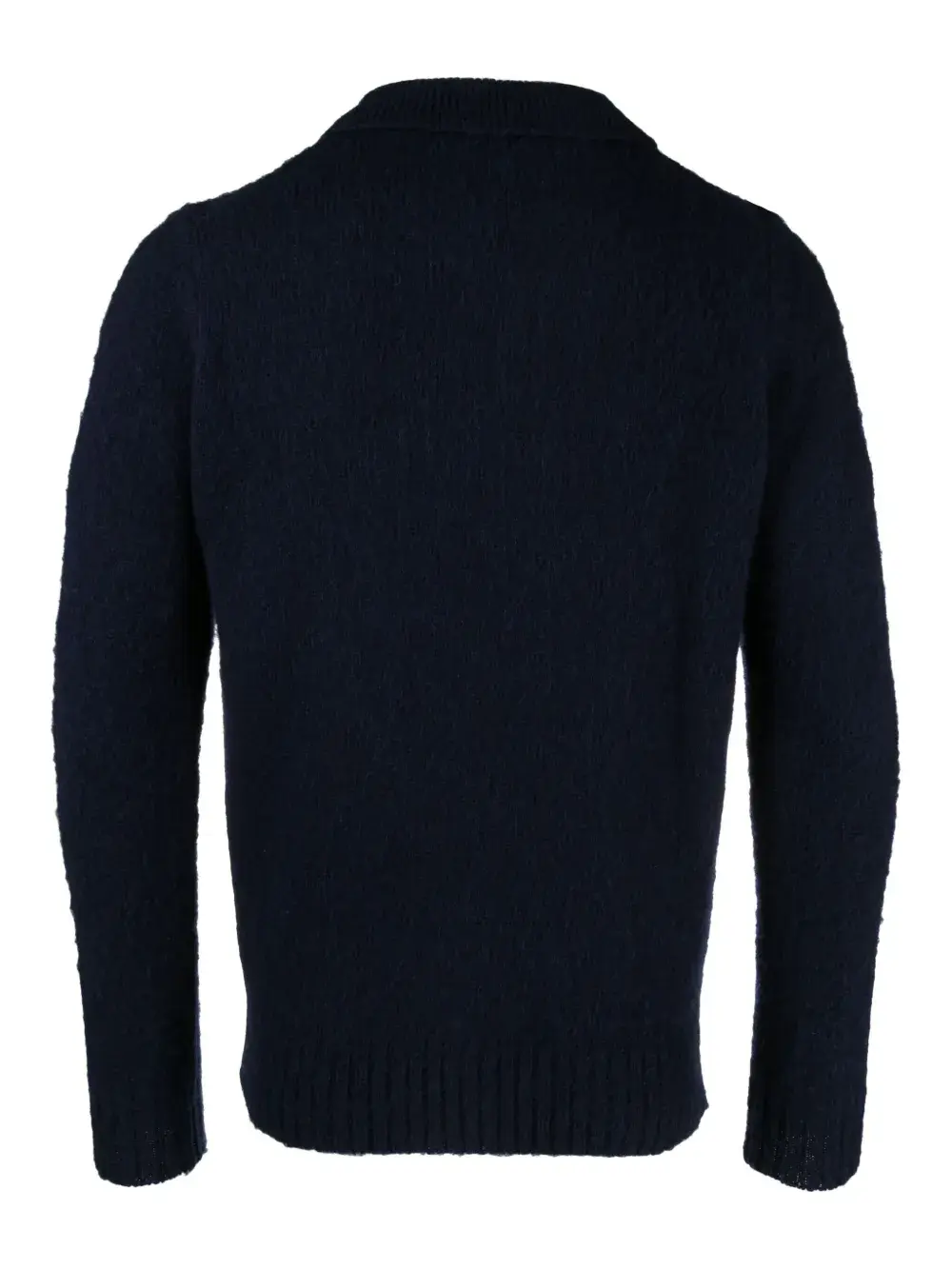 Темно-синий, шерсть, трикотажный материал, воротник поло, планка на пуговицах спереди, длинные рукава и прямой подол