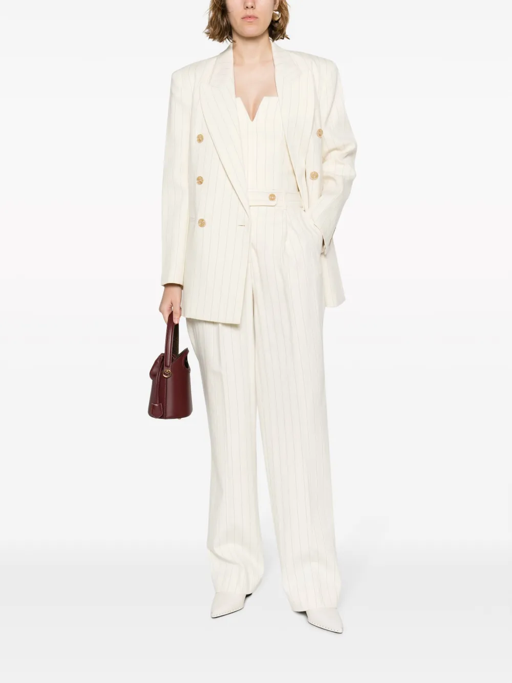 Кремово-белый, смесь шерсти и хлопка, узор в тонкую полоску, отложный воротник, застежка на молнии сзади, без бретелей и укороченная длина