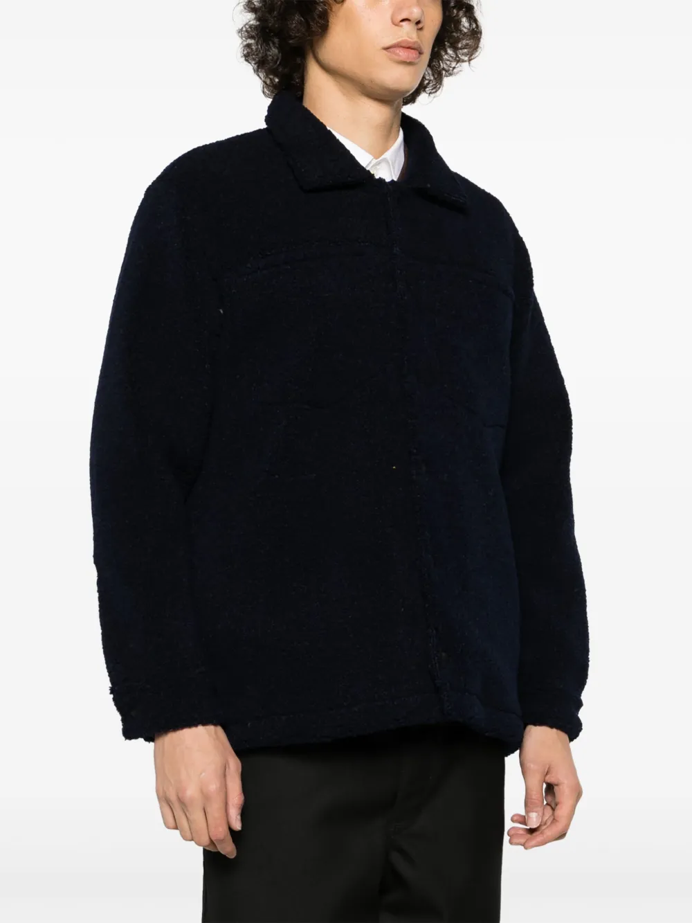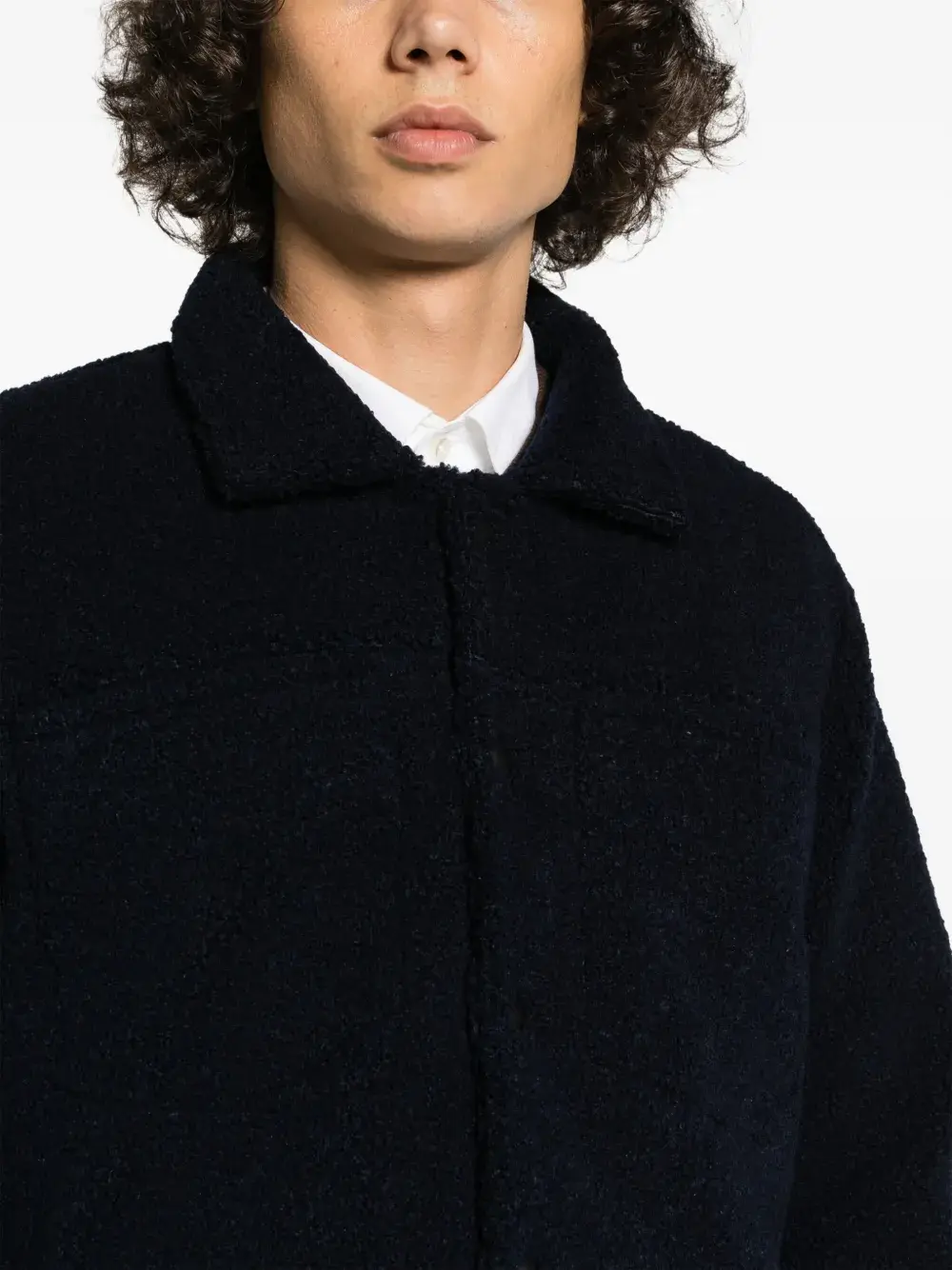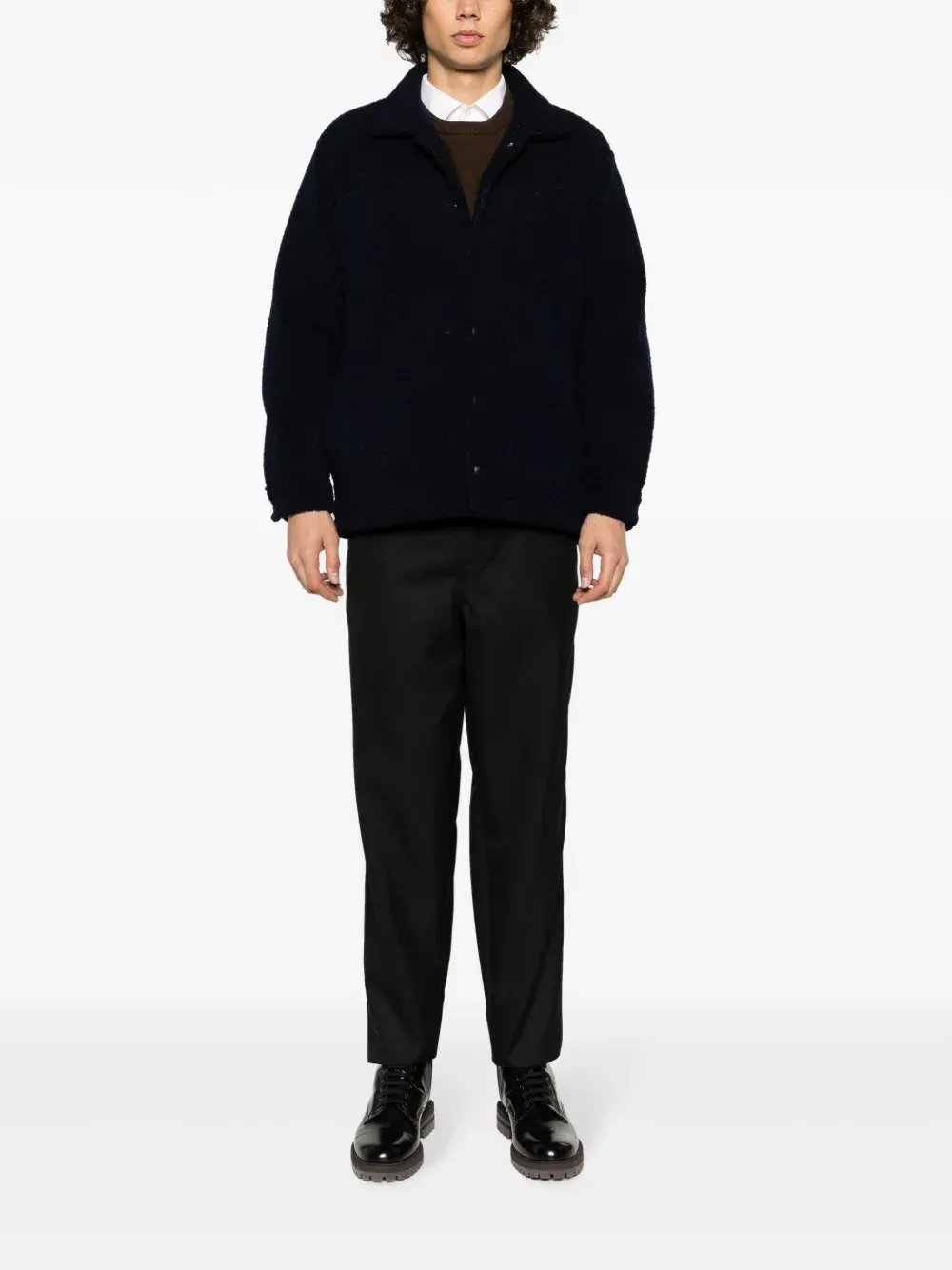 Темно-синий, ткань букле, косой воротник, застежка на кнопках спереди, длинные рукава, манжеты с застежкой на кнопки и два вшитых кармана по бокам
