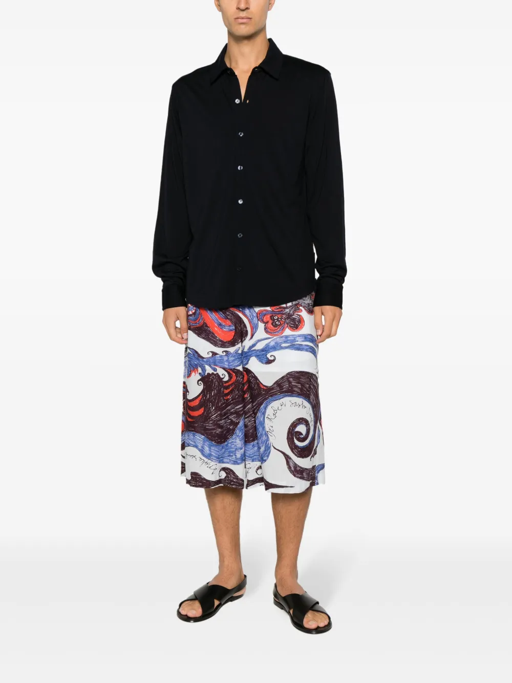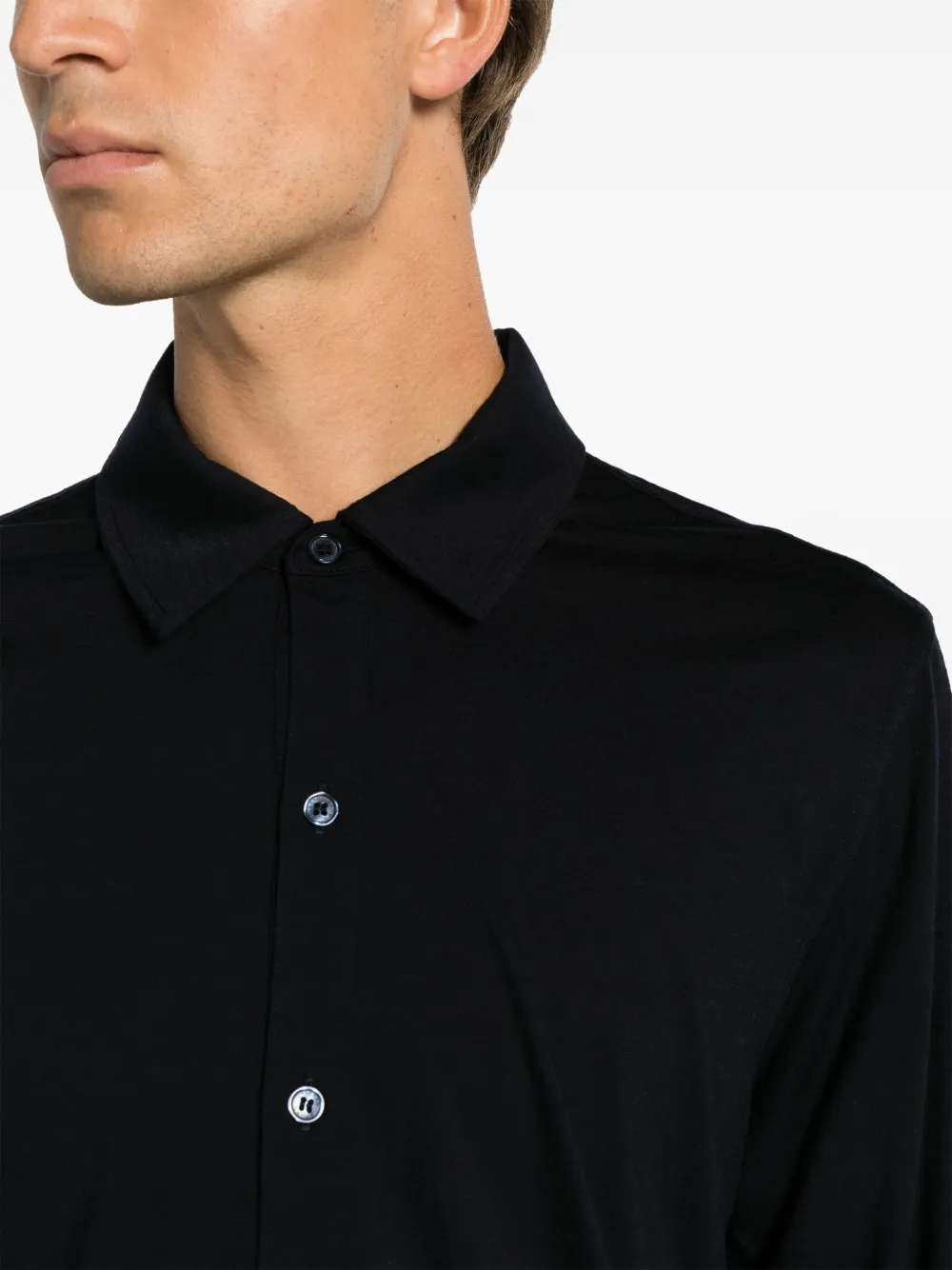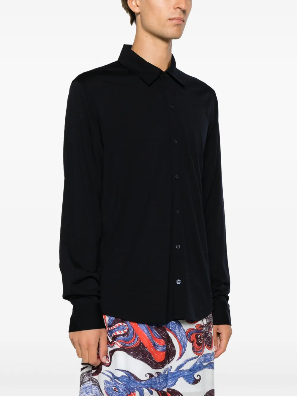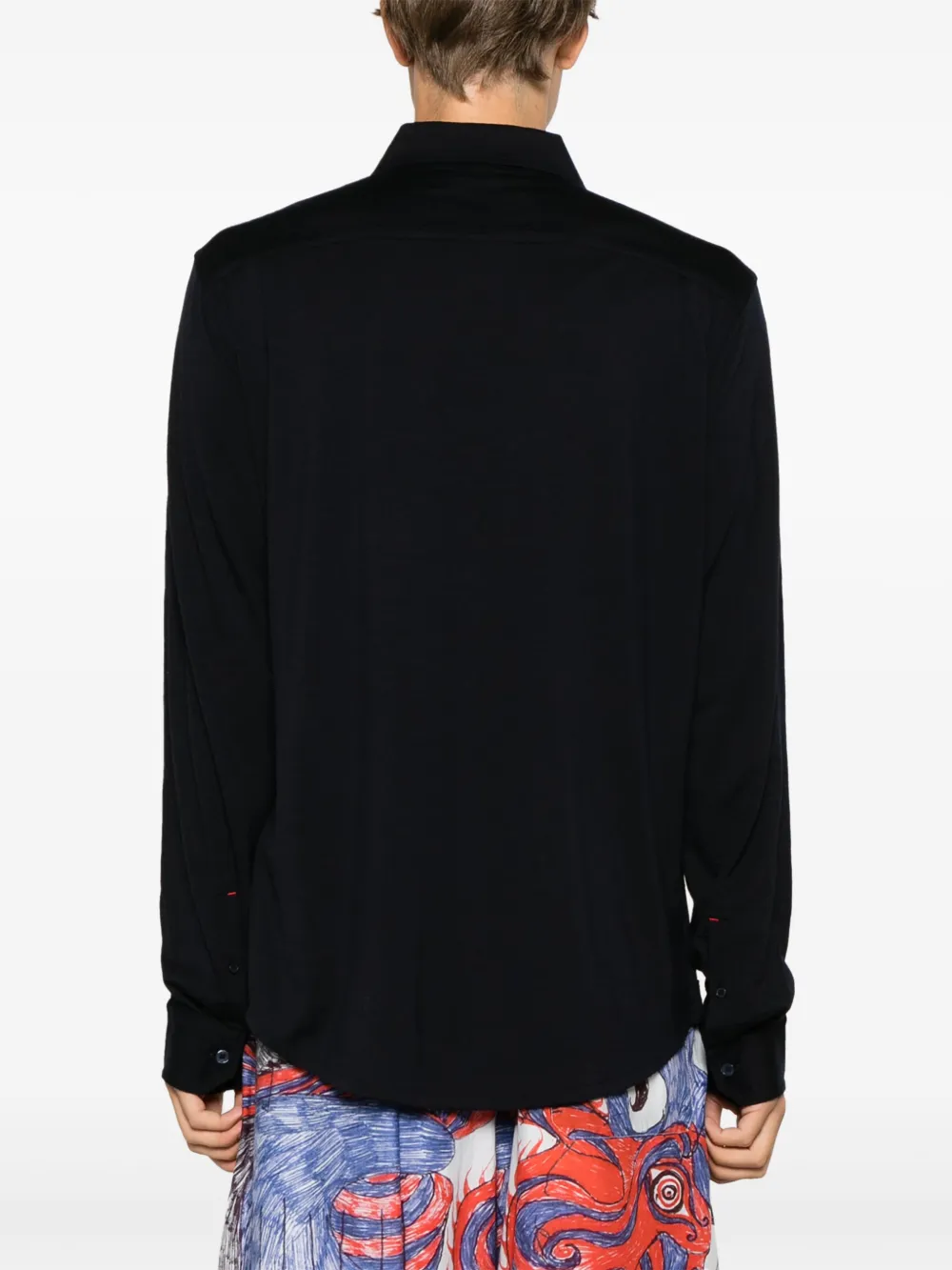 Темно-синий, шерсть мериноса, классический воротник, застежка на пуговицах спереди, длинные рукава, манжеты на пуговицах и прямой подол