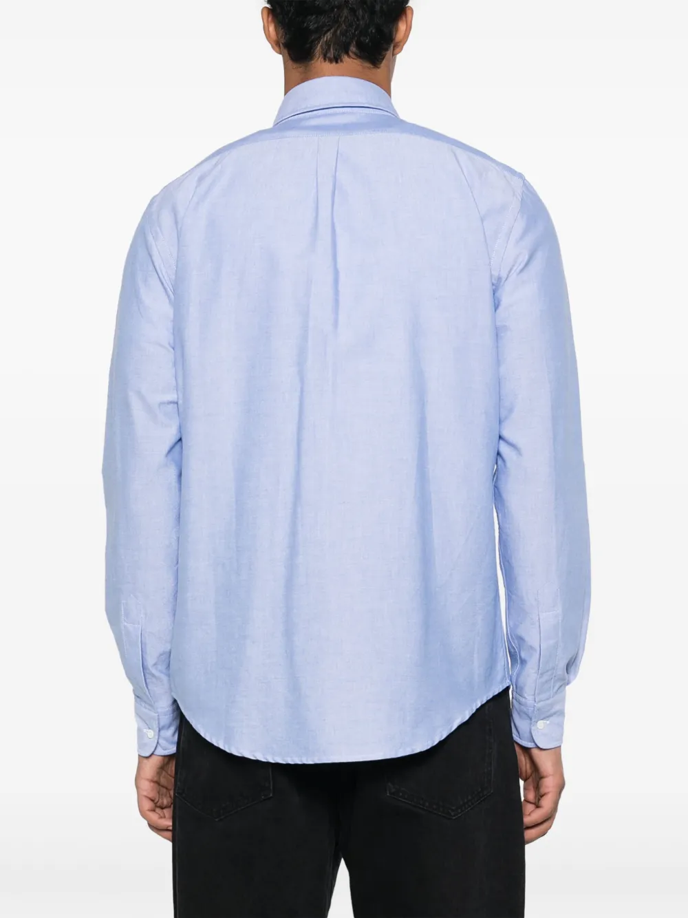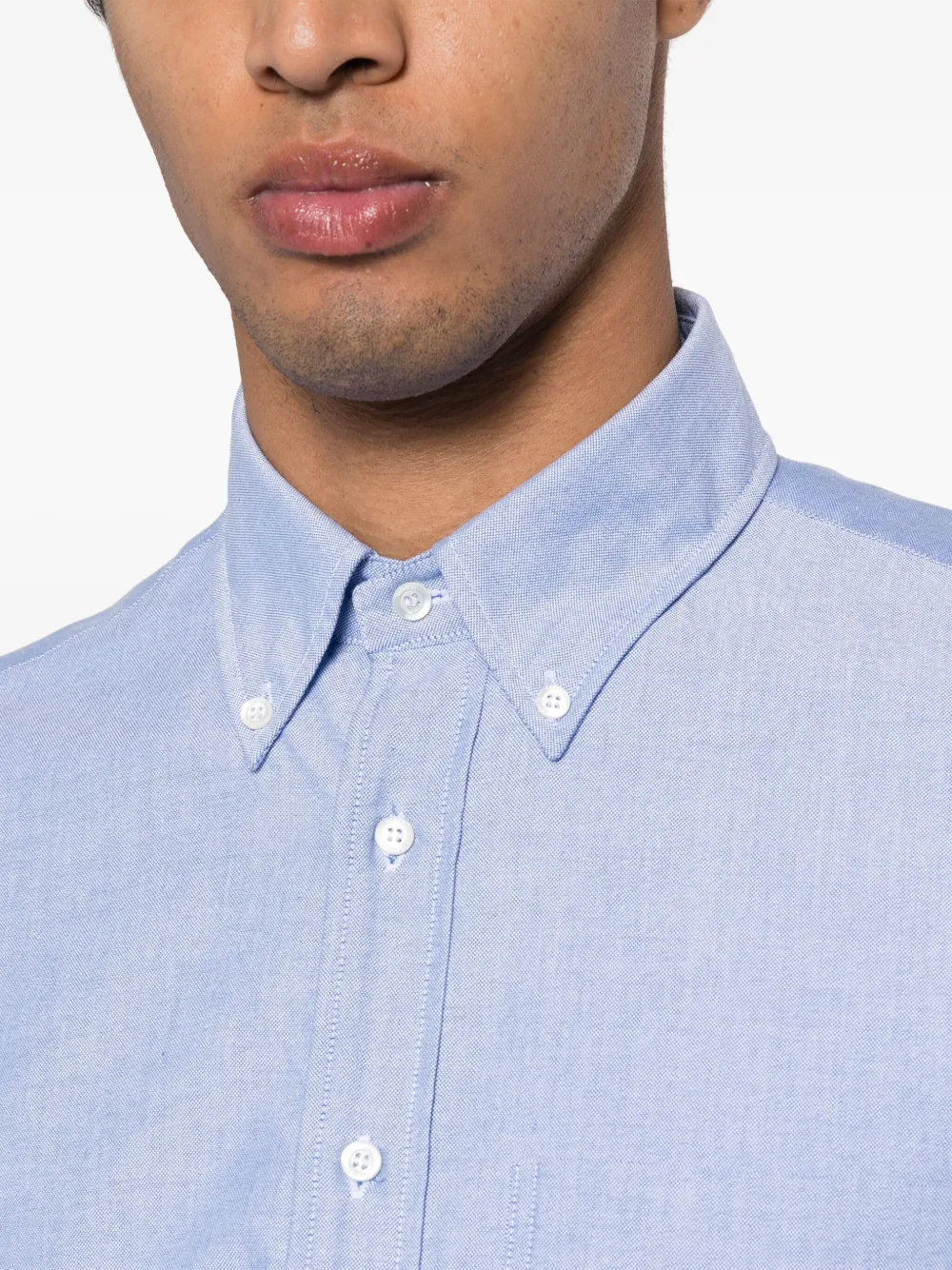 Голубой, хлопок, воротник на пуговицах, застежка на пуговицах спереди, длинные рукава, рукава с манжетами на пуговицах и закругленный подол
