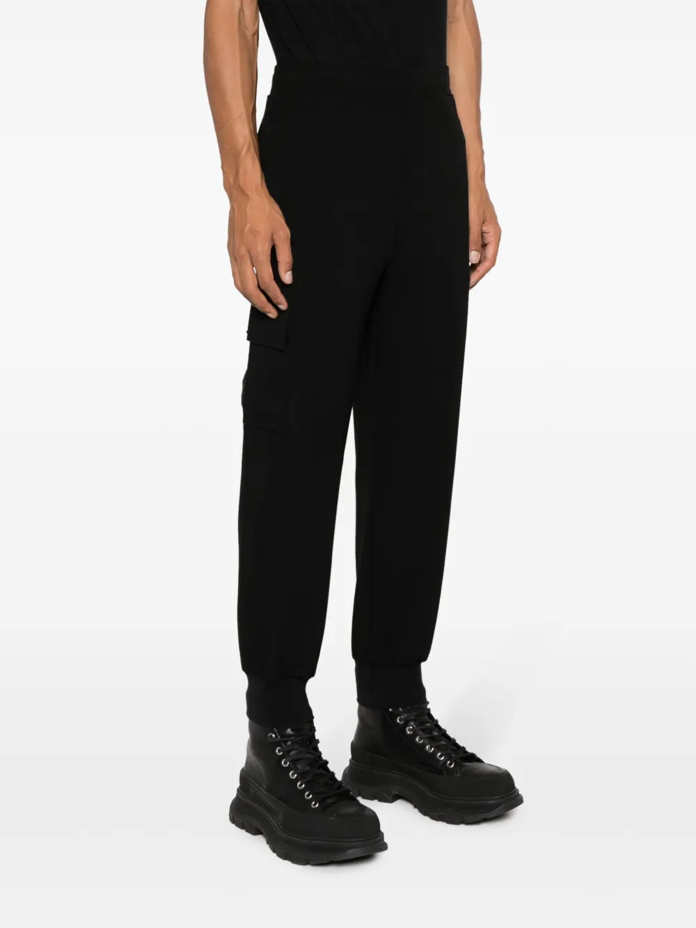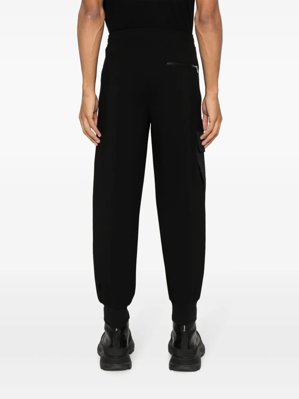 Черный, эластичный материал, эластичный пояс, два прорезных кармана по бокам, накладной карман сбоку, карман на молнии сзади, эластичные манжеты и зауженный крой