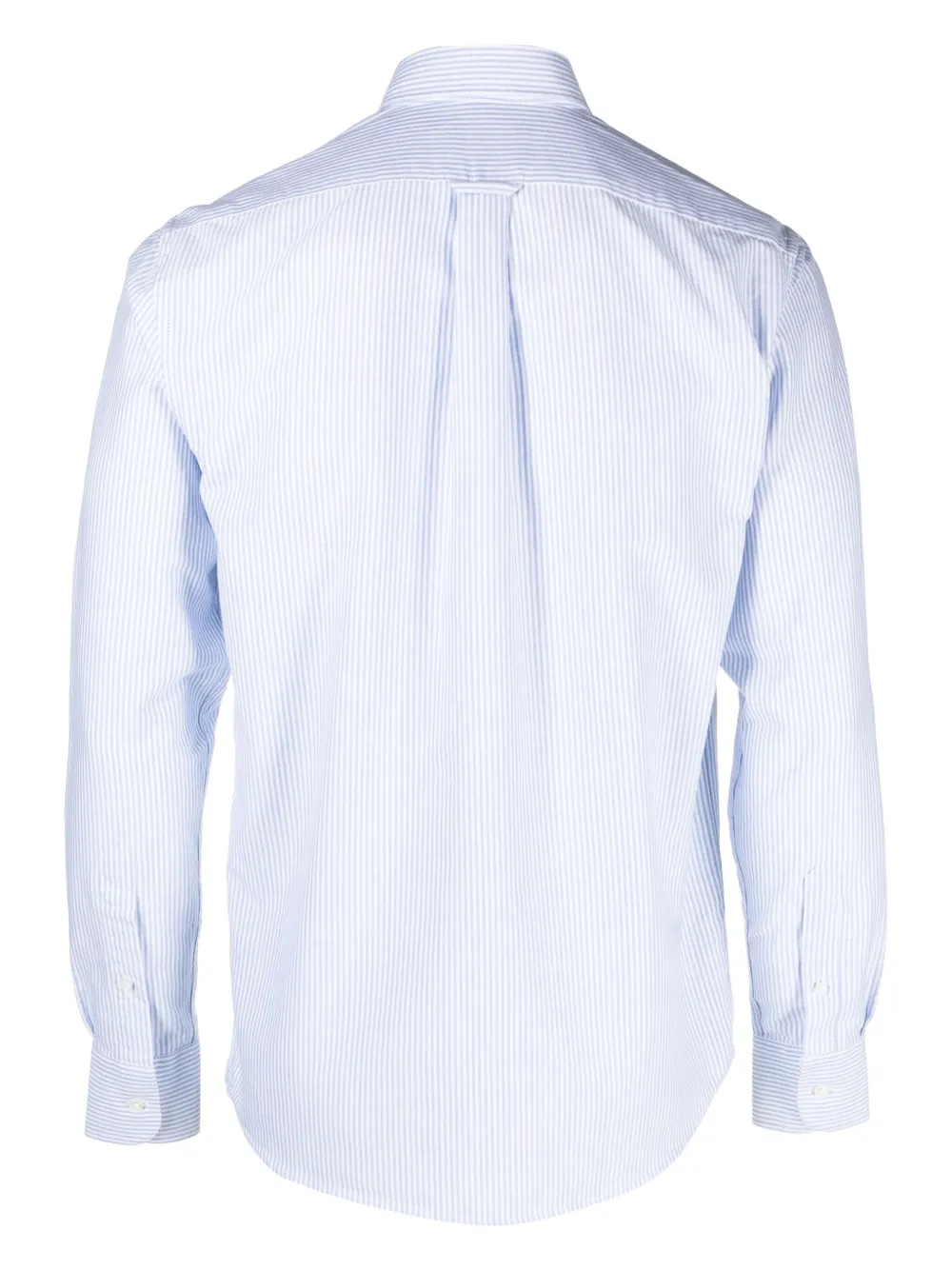 Пудрово-голубой, кремовый, хлопок, узор в вертикальную полоску, воротник на пуговицах, застежка на пуговицах спереди, нагрудный накладной карман, длинные рукава, рукава с манжетами на пуговицах и закругленный подол