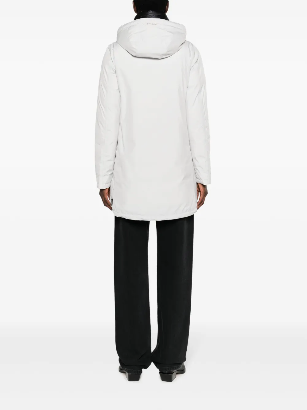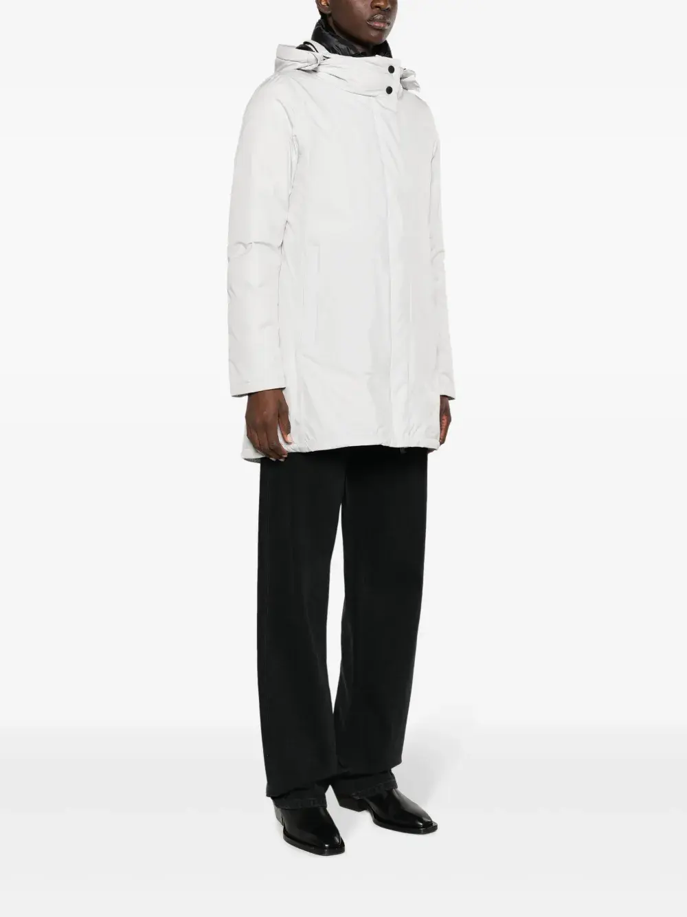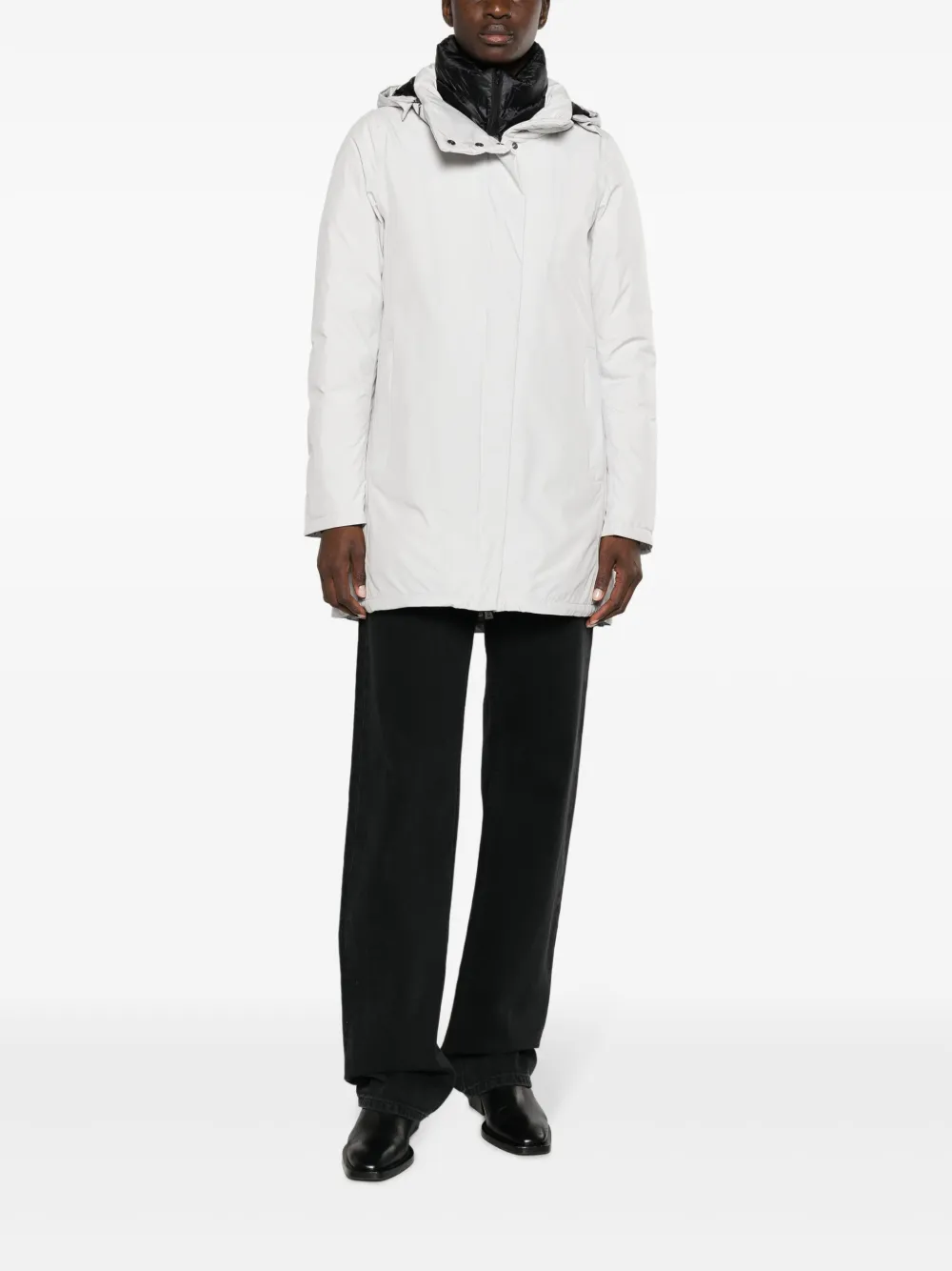 Светло-серый, наполнитель из пуха и перьев, логотип на капюшоне, воротник-стойка, потайная застежка спереди, длинные рукава, эластичные манжеты, два прорезных кармана сбоку и прямой подол