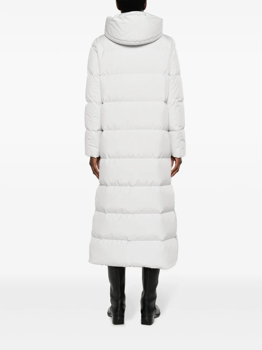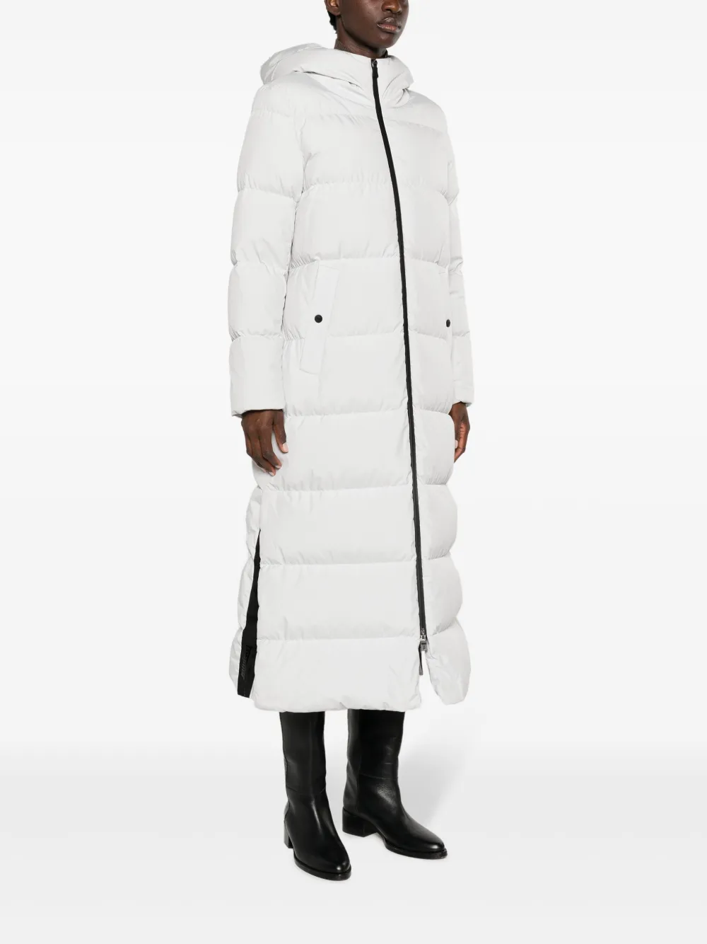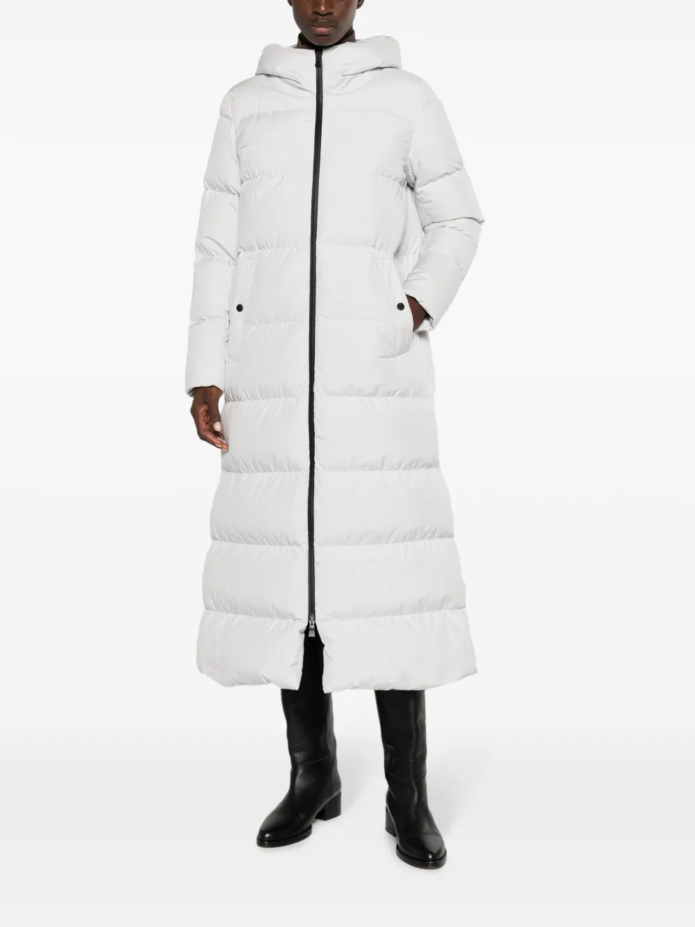 Светло-серый, наполнитель из пуха и перьев, дутый материал, стеганая модель, жаккардовый логотип, высокий воротник, классический капюшон, застежка на молнии спереди, длинные рукава, два боковых кармана с застежкой на кнопки и прямой подол