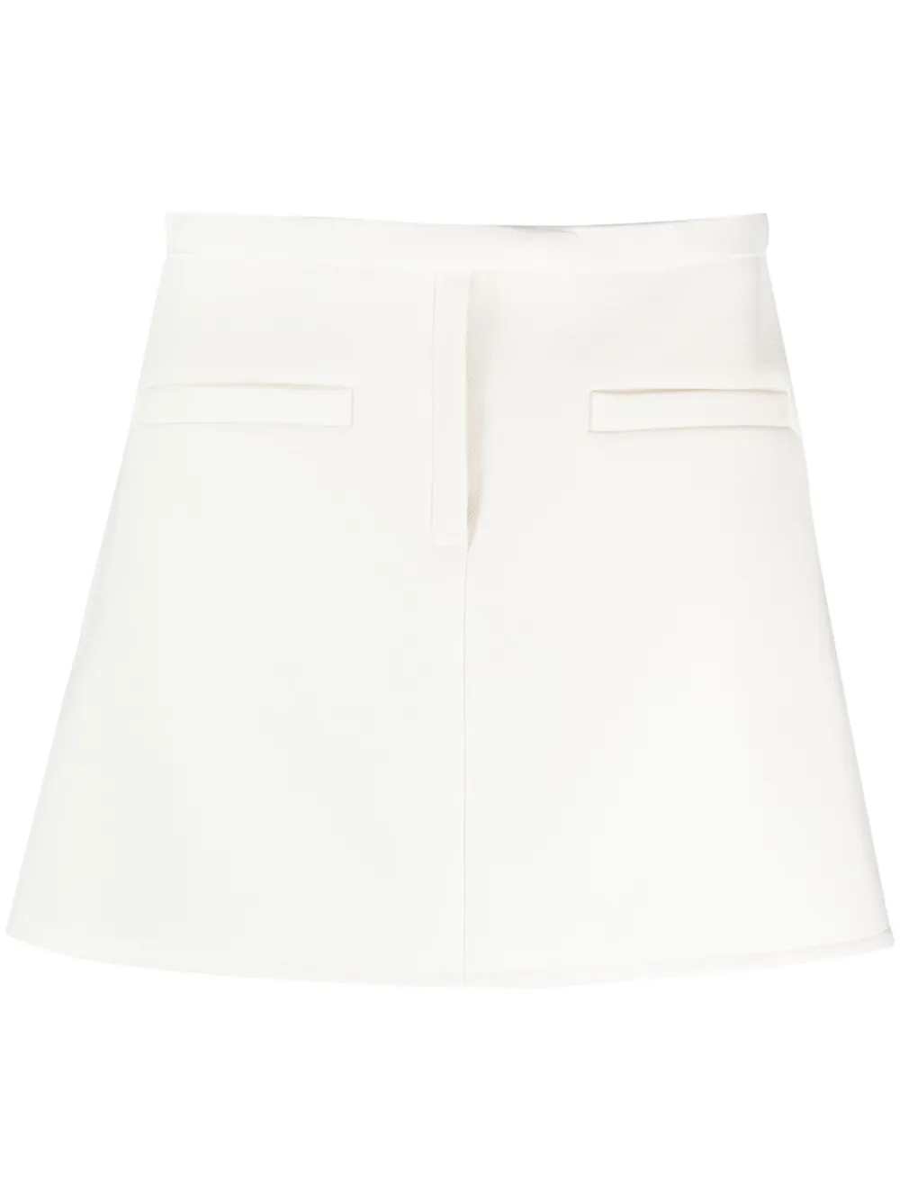 Молочно-белый, креповая текстура, силуэт «трапеция», потайная застежка на молнии и пуговицах, два передних кармана с листочкой, завышенная талия, длина до бедер и прямой подол