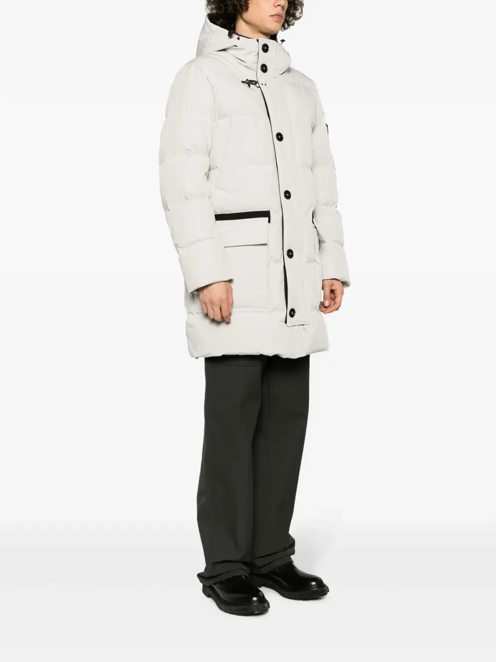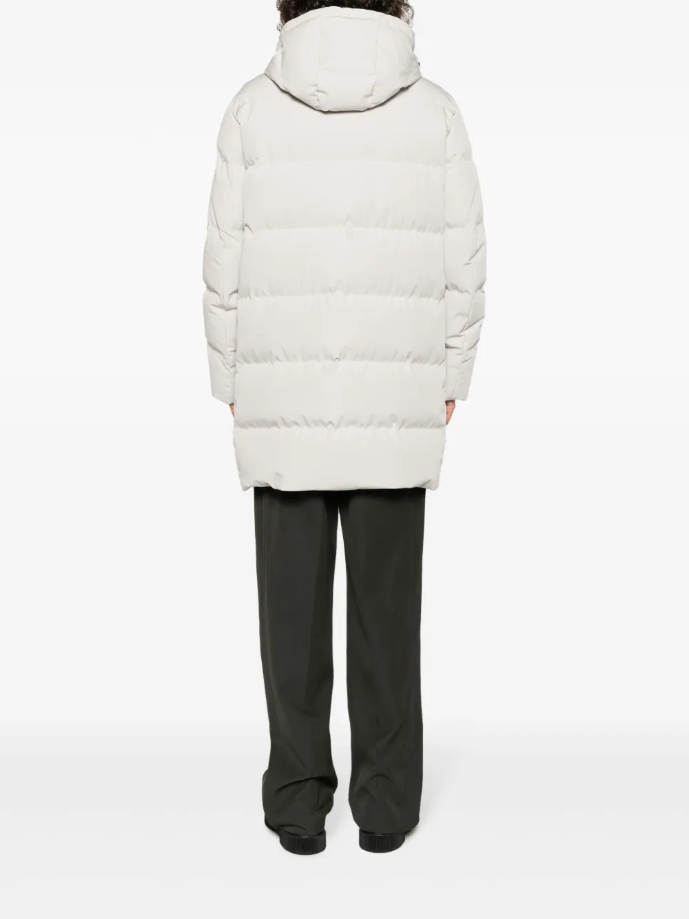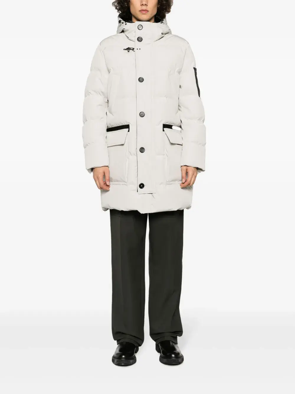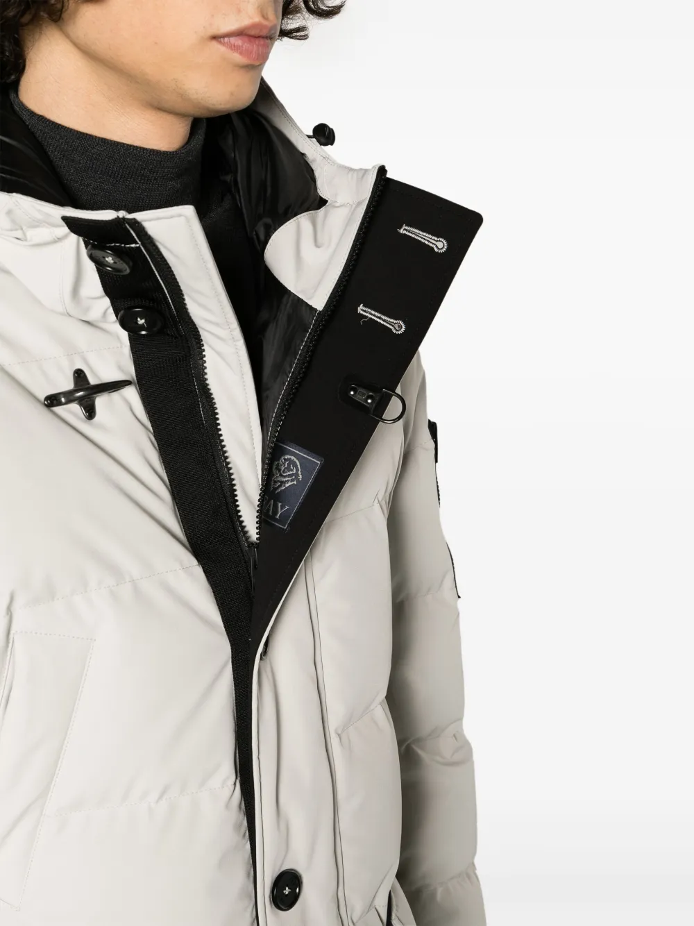 Пепельно-серый, утиный пух, дутый материал, стеганая модель, затягивающийся на шнурок капюшон, застежка на пуговицах спереди, застежка на крючок, длинные рукава, два нагрудных кармана с листочкой, два кармана с клапанами по бокам, карман с молнией на рукаве, внутренний карман и прямой подол