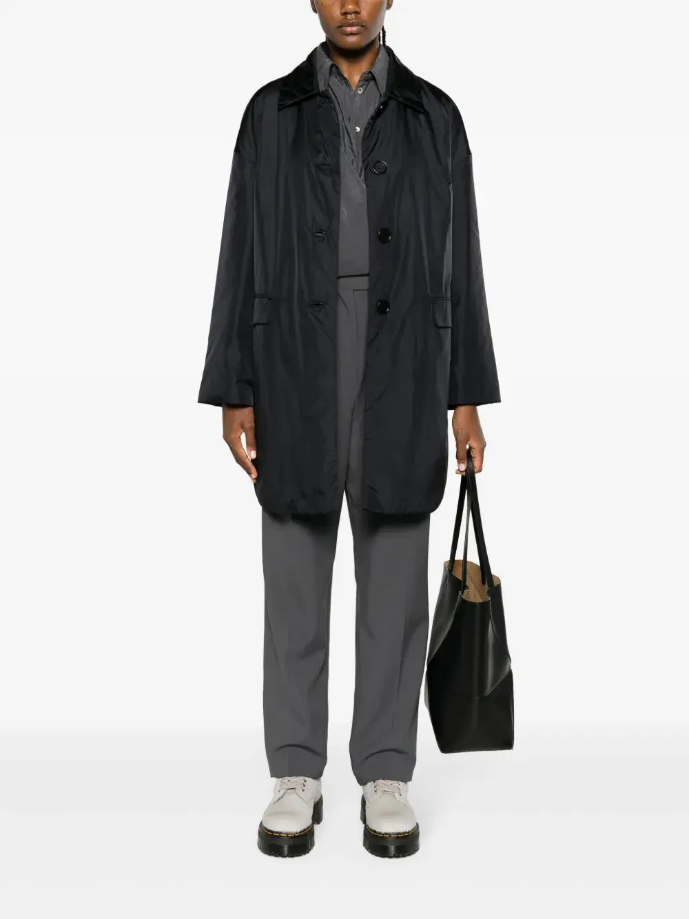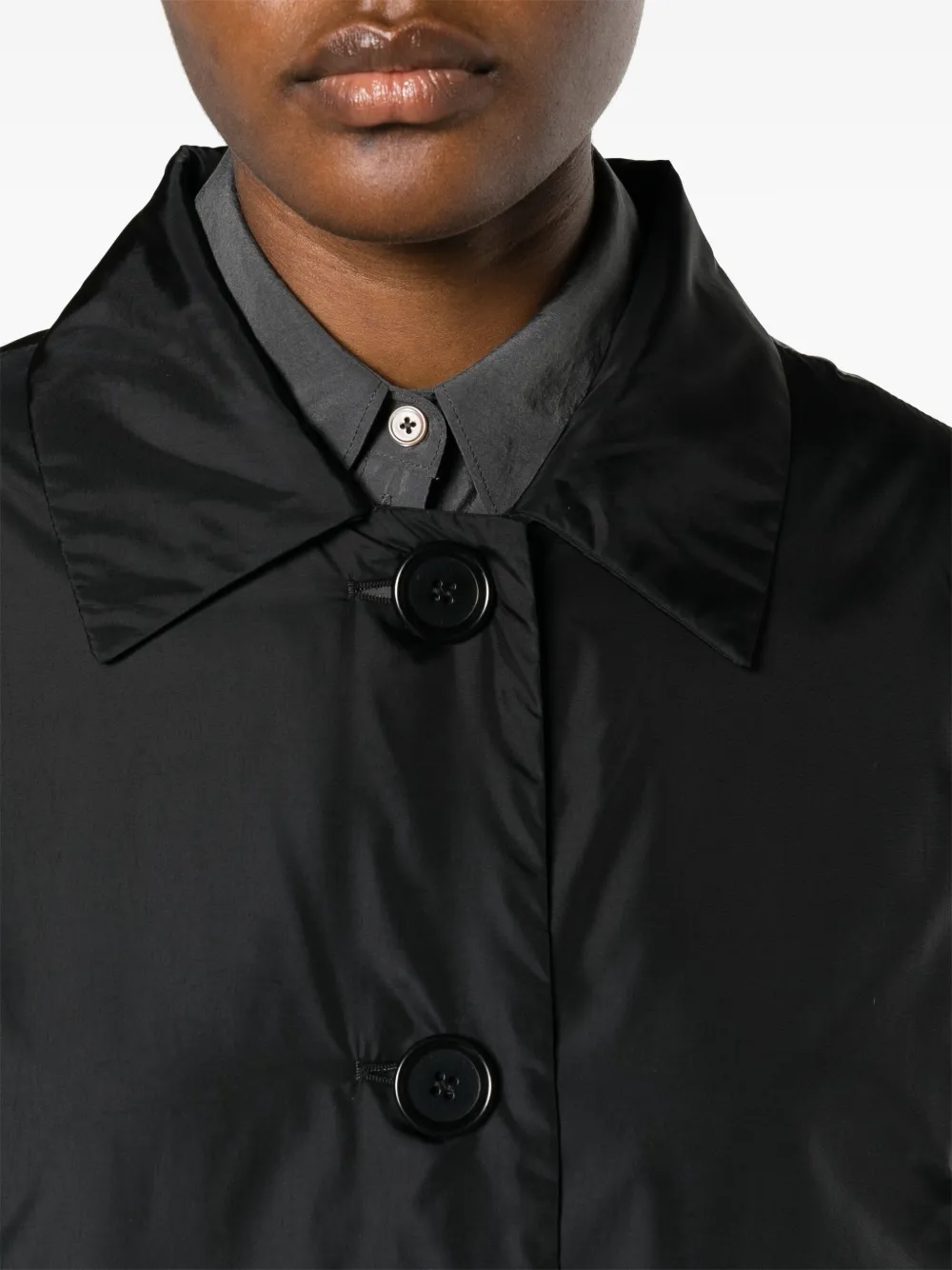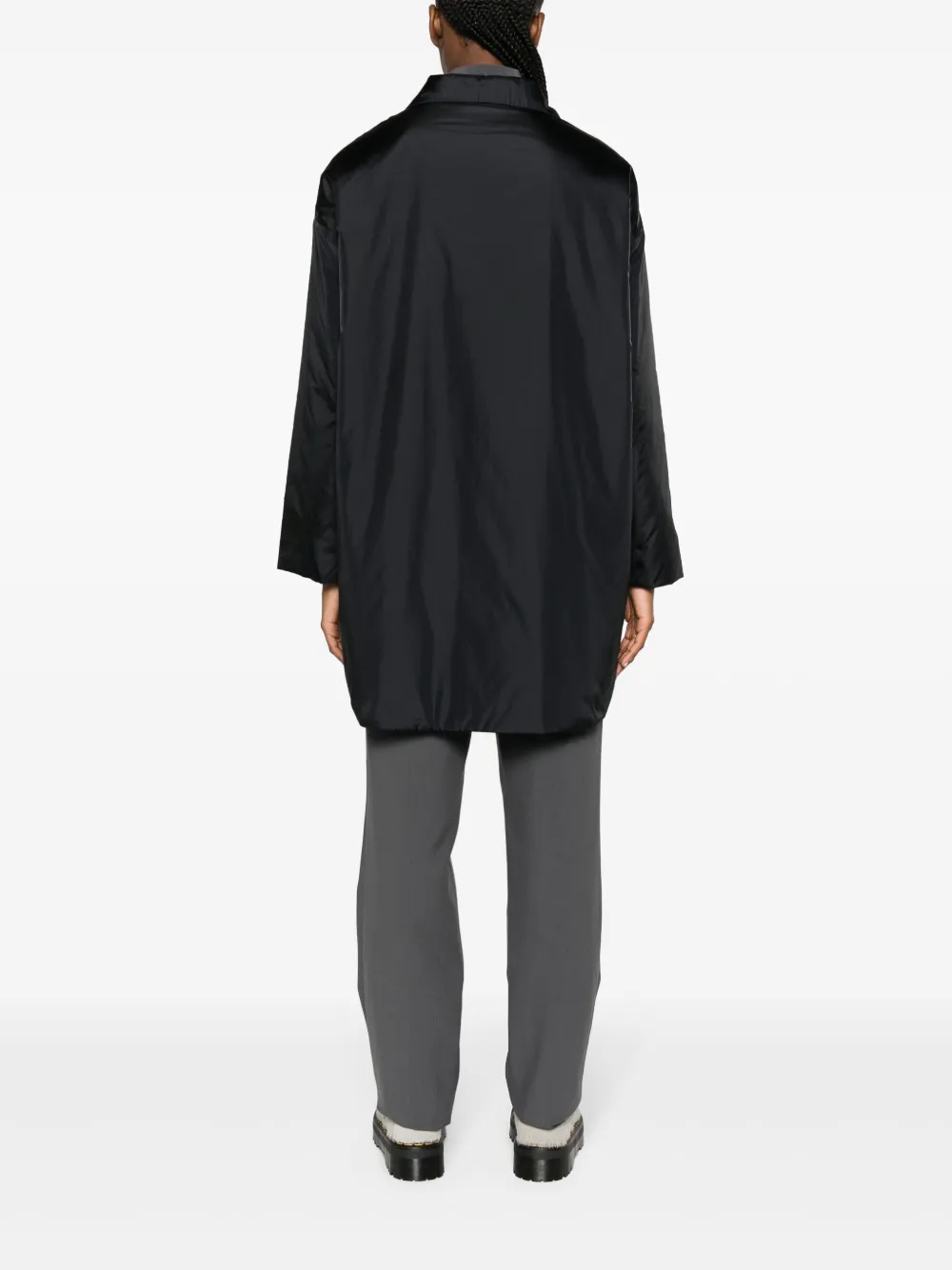 Черный, дутый материал, двойные стенки с изоляцией, отложной воротник, застежка на пуговицах спереди, длинные рукава, два передних кармана с клапанами, прямой подол и длина до бедер.
