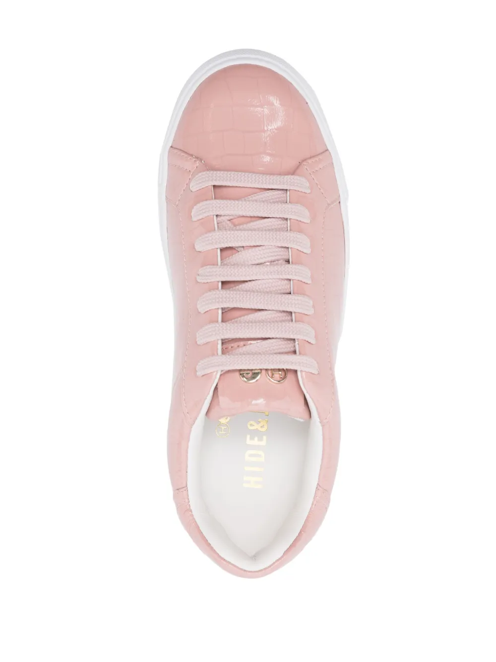 Расцветка Blush Pink, телячья кожа, тиснение под кожу крокодила, глянцевый финиш, вставки, золотистый металлический логотип, закругленный носок, шнуровка спереди, стелька с логотипом и плоская платформа.