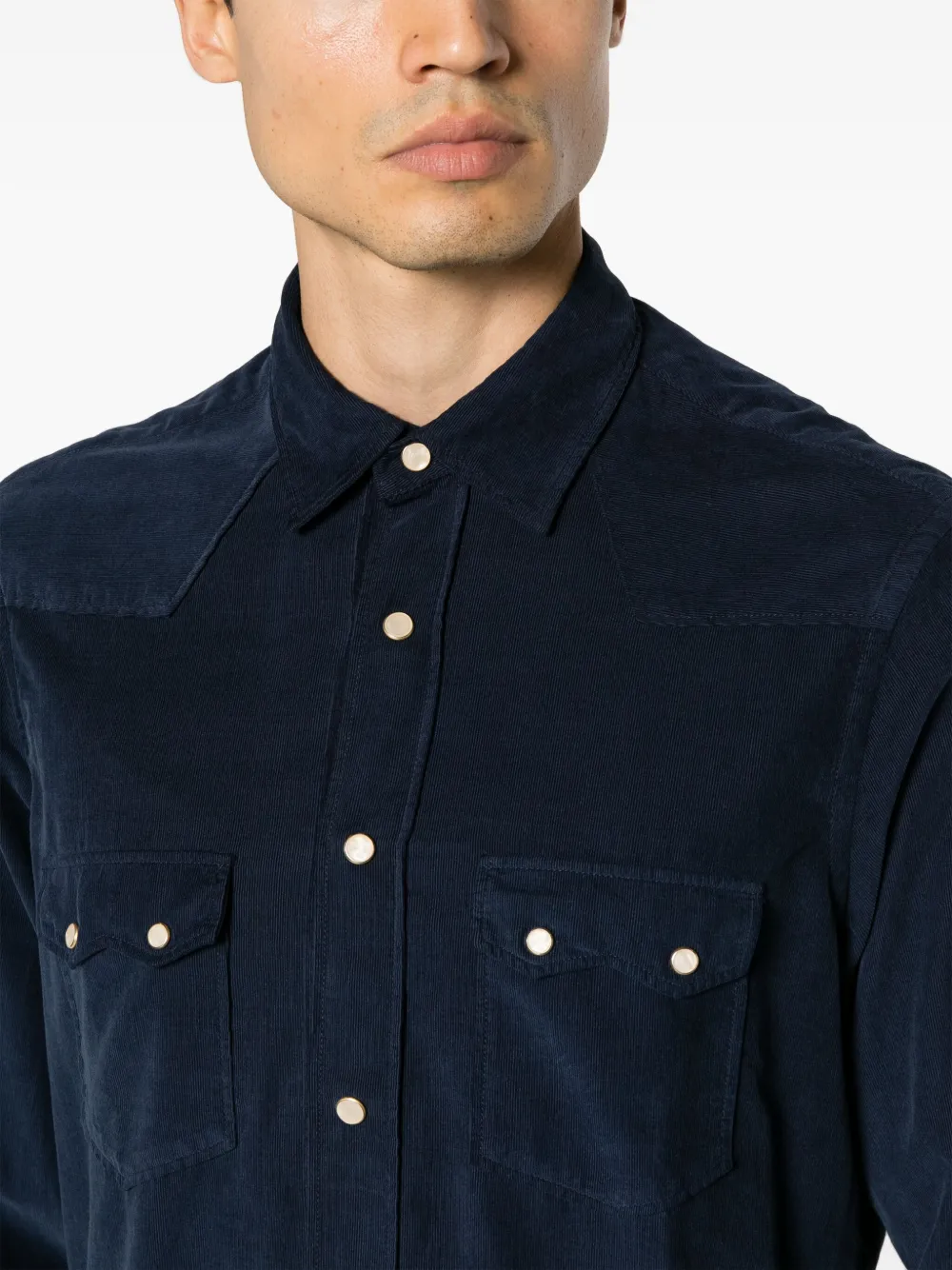 Темно-синий, хлопок, вельветовый материал, классический воротник, застежка на пуговицах спереди, длинные рукава, манжеты с застежкой на кнопки, два боковых кармана с застежкой на кнопки и закругленный подол