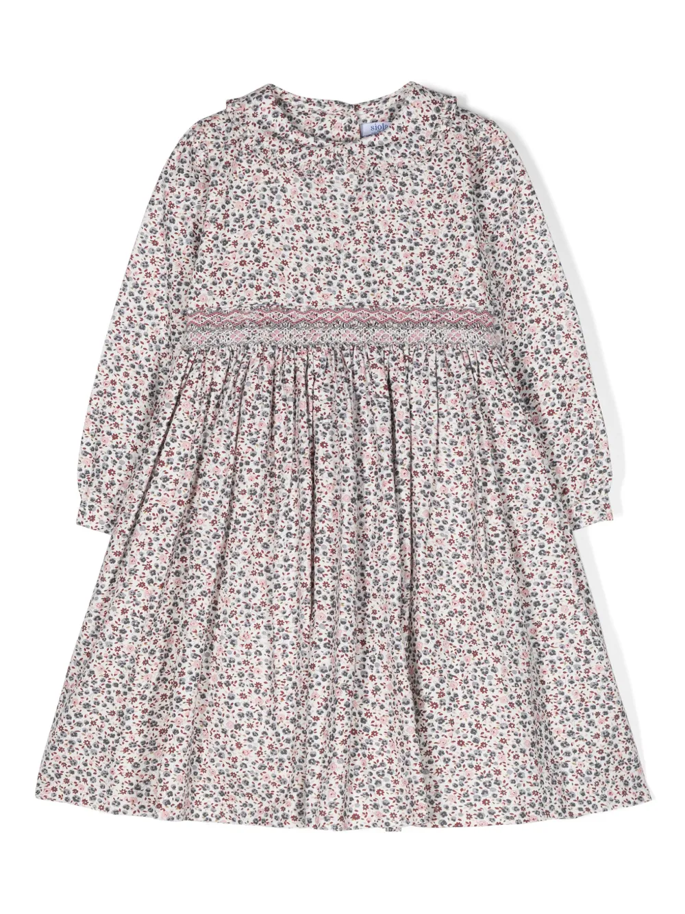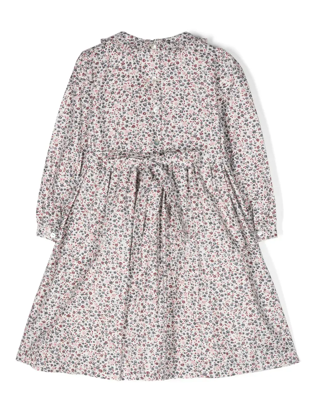 Сплошной цветочный принт, вышивка, бант, воротник с оборками, застежка на пуговицы сзади, застежка на завязке сзади, длинные рукава, манжеты на пуговицах, приталенный силуэт, пышная юбка и прямой подол