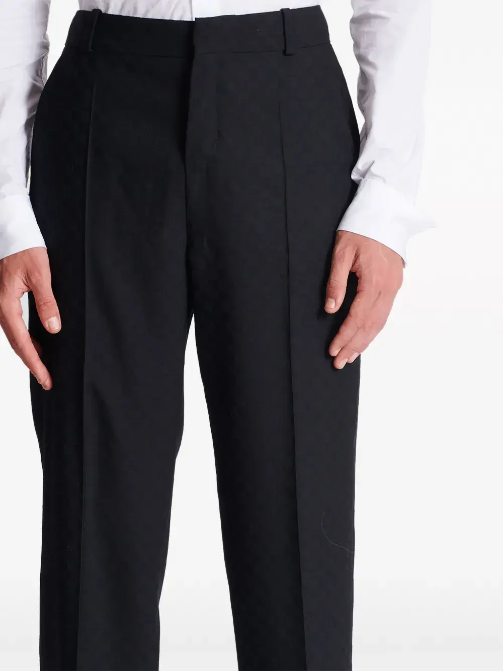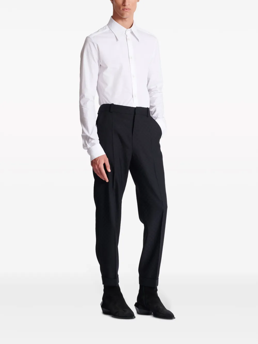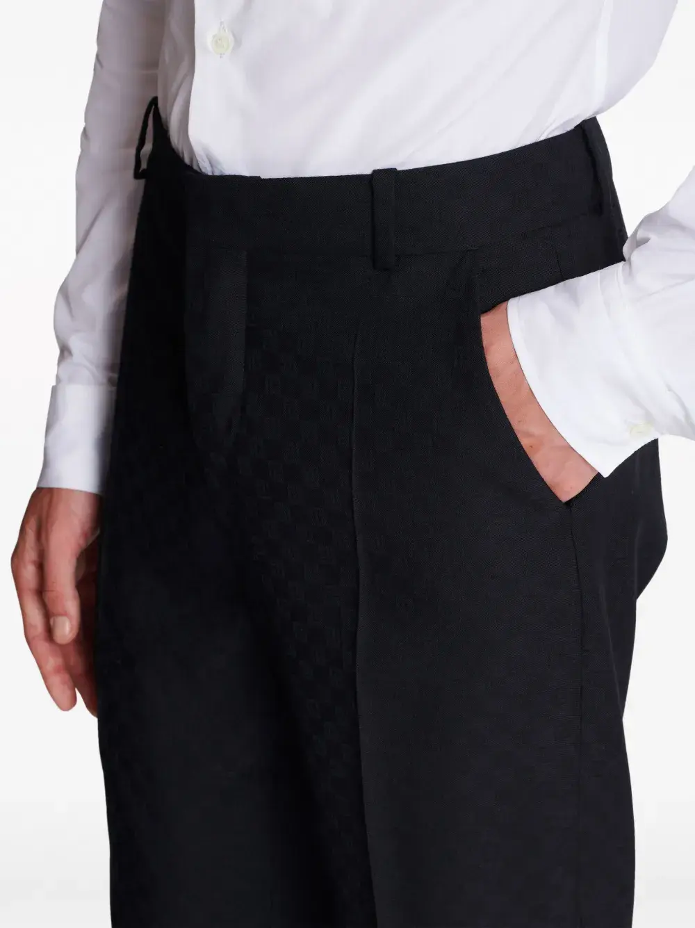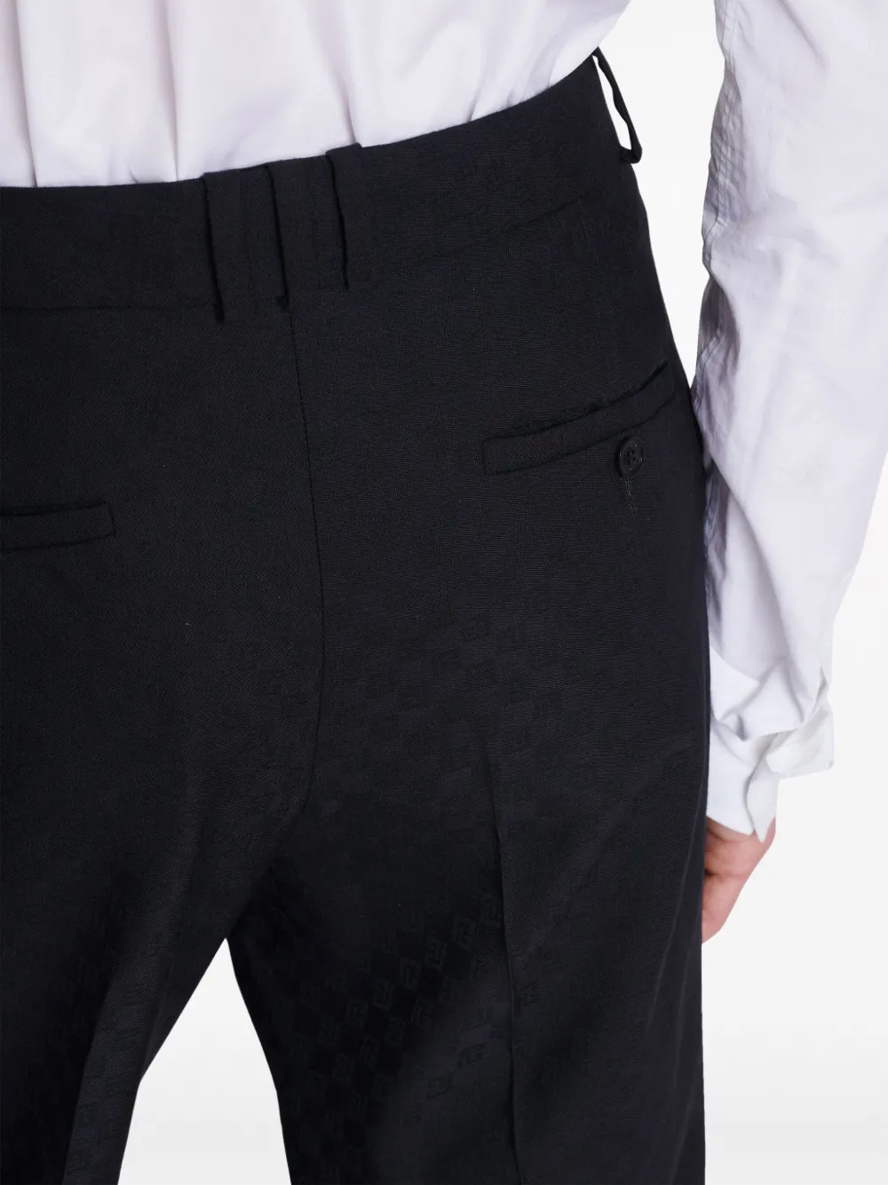 Черный, шерсть, жаккард с монограммой, петли для ремня, потайная застежка спереди, два прорезных кармана по бокам, два прорезных кармана на пуговицах сзади и прямой крой