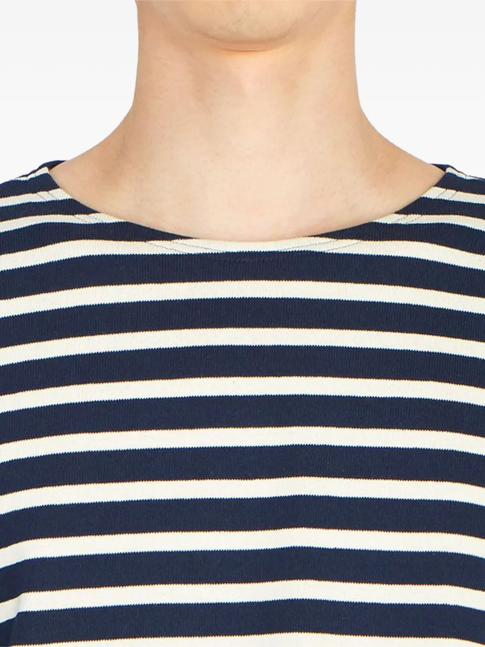 темно-синяя и белая полоска, длинные рукава, круглый вырез
