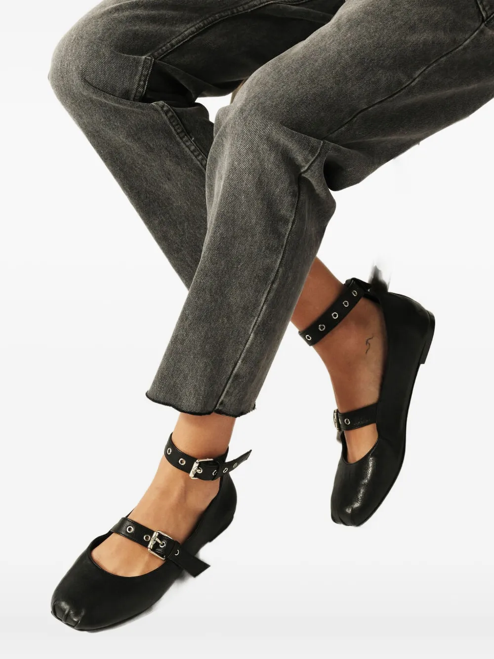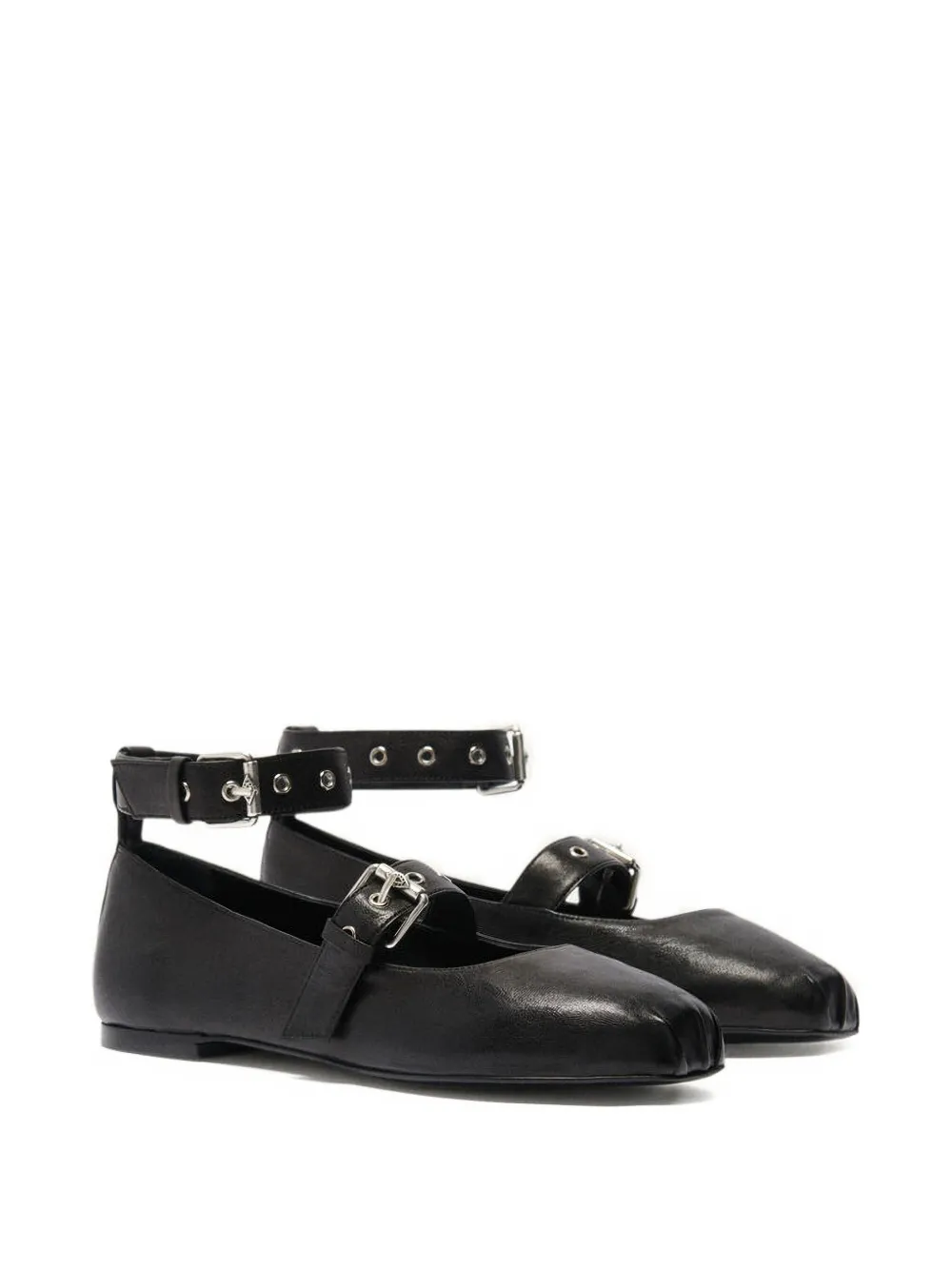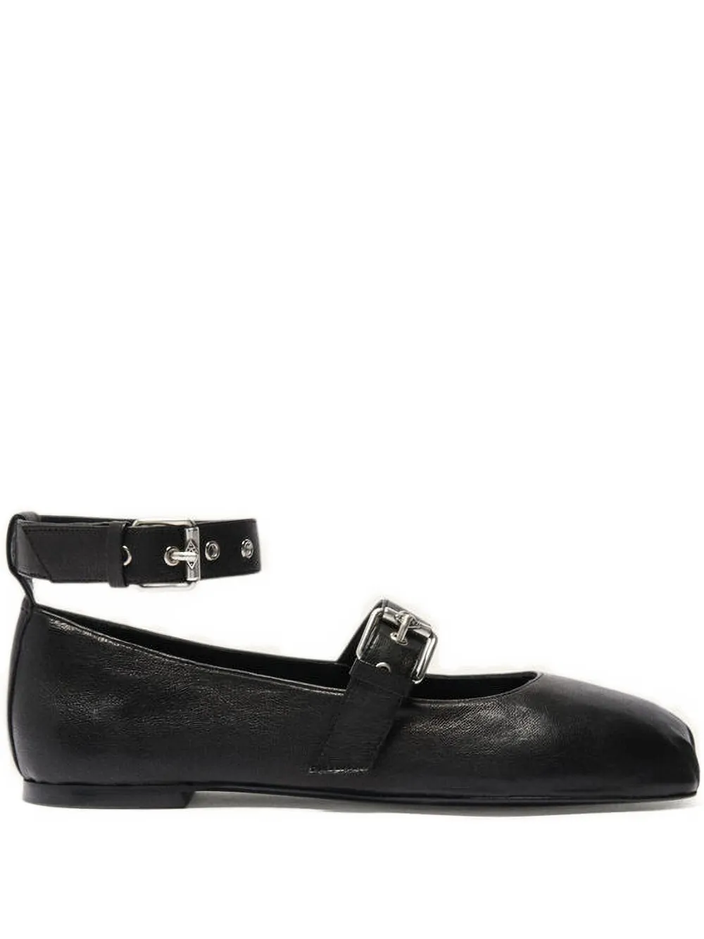 Верх из черной кожи, застежка на две пряжки, ремешок на щиколотке, отделка люверсами, квадратный носок