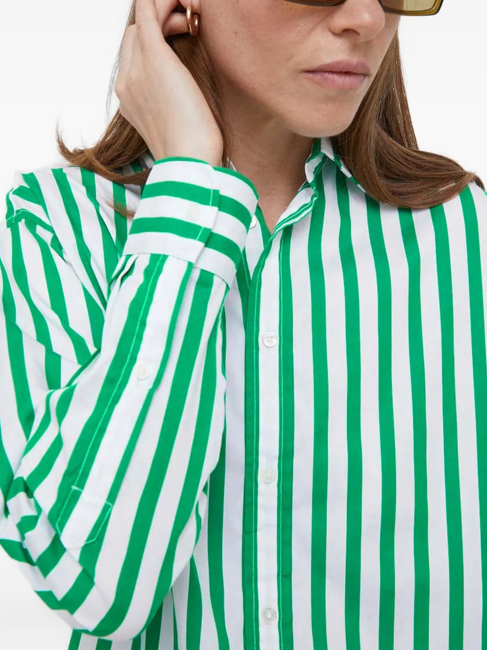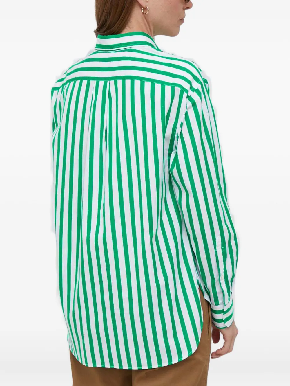 белые и зелёные вертикальные полосы, манжеты на пуговицах, застёжка на пуговицы, вышитый логотип, классический воротник