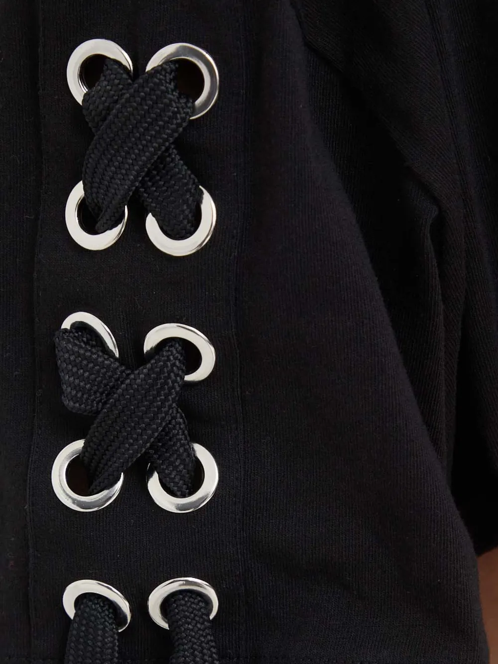 черная футболка с люверсами, шнуровкой, короткими рукавами, круглым вырезом и присборенным подолом